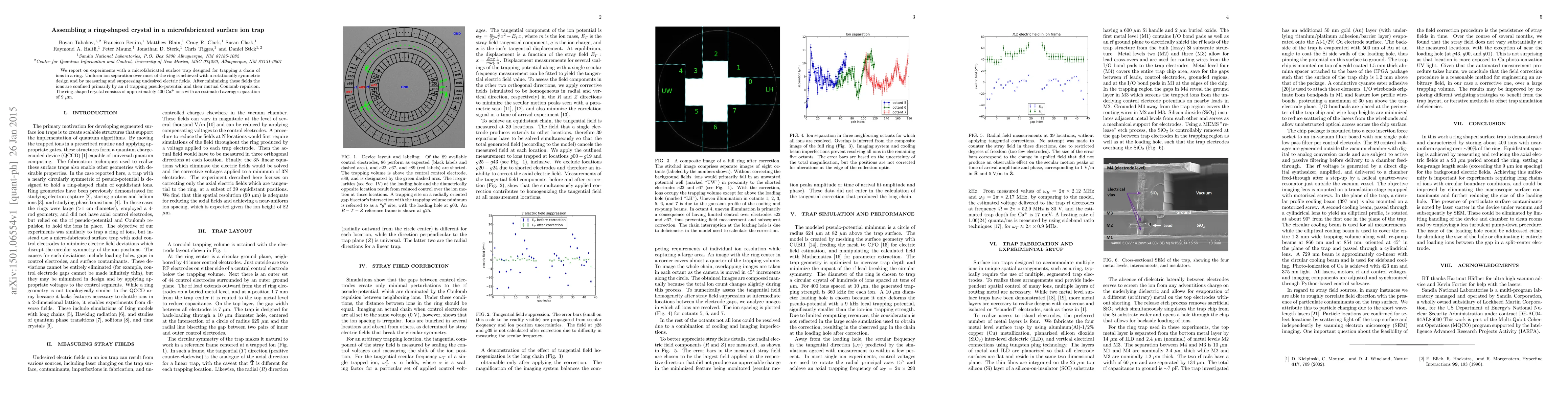 We report on experiments with a microfabricated surface trap designed for trapping a chain of ions in a ring. Uniform ion separation over most of the ring is achieved with a rotationally symmetric design and by measuring and suppressing undesired electric fields. After minimizing these fields the ions are confined primarily by an rf trapping pseudo-potential and their mutual Coulomb repulsion. The ring-shaped crystal consists of approximately 400 Ca$^+$ ions with an estimated average separation of 9 $\mu m$.