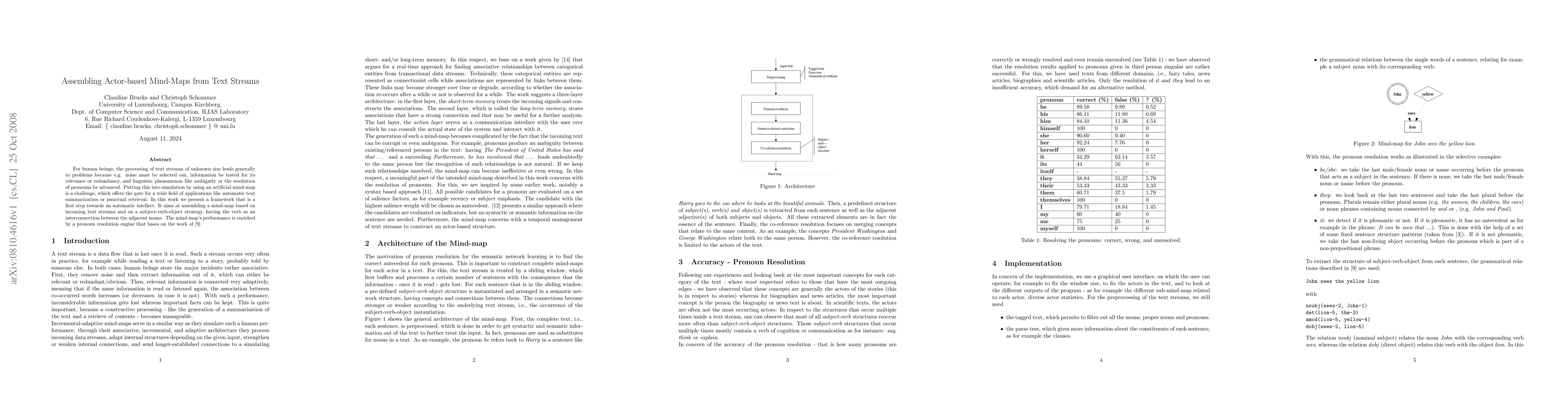 For human beings, the processing of text streams of unknown size leads generally to problems because e.g. noise must be selected out, information be tested for its relevance or redundancy, and linguistic phenomenon like ambiguity or the resolution of pronouns be advanced. Putting this into simulation by using an artificial mind-map is a challenge, which offers the gate for a wide field of applications like automatic text summarization or punctual retrieval. In this work we present a framework that is a first step towards an automatic intellect. It aims at assembling a mind-map based on incoming text streams and on a subject-verb-object strategy, having the verb as an interconnection between the adjacent nouns. The mind-map's performance is enriched by a pronoun resolution engine that bases on the work of D. Klein, and C. D. Manning.