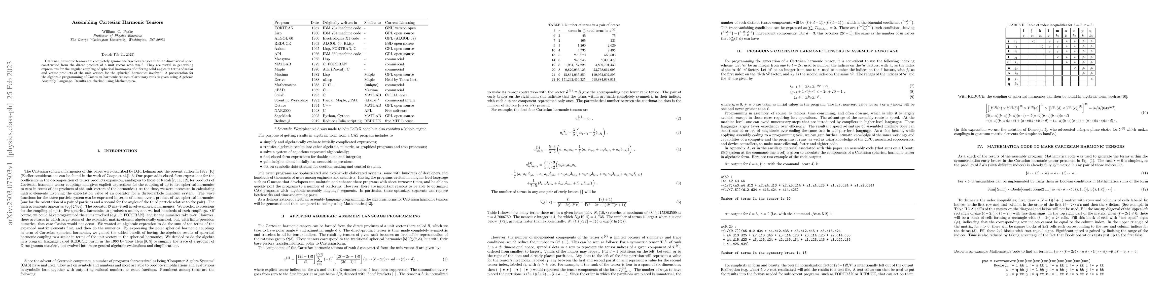 Cartesian harmonic tensors are completely symmetric traceless tensors in three dimensional space constructed from the direct product of unit vectors. They are useful in generating expressions for the angular coupling of spherical harmonics of differing solid angles in terms of scalar and vector products of the unit vectors for the spherical harmonics involved. A presentation for the algebraic programming of Cartesian harmonic tensors of arbitrary rank is given using Algebraic Assembly Language. Results are checked using Mathematica.