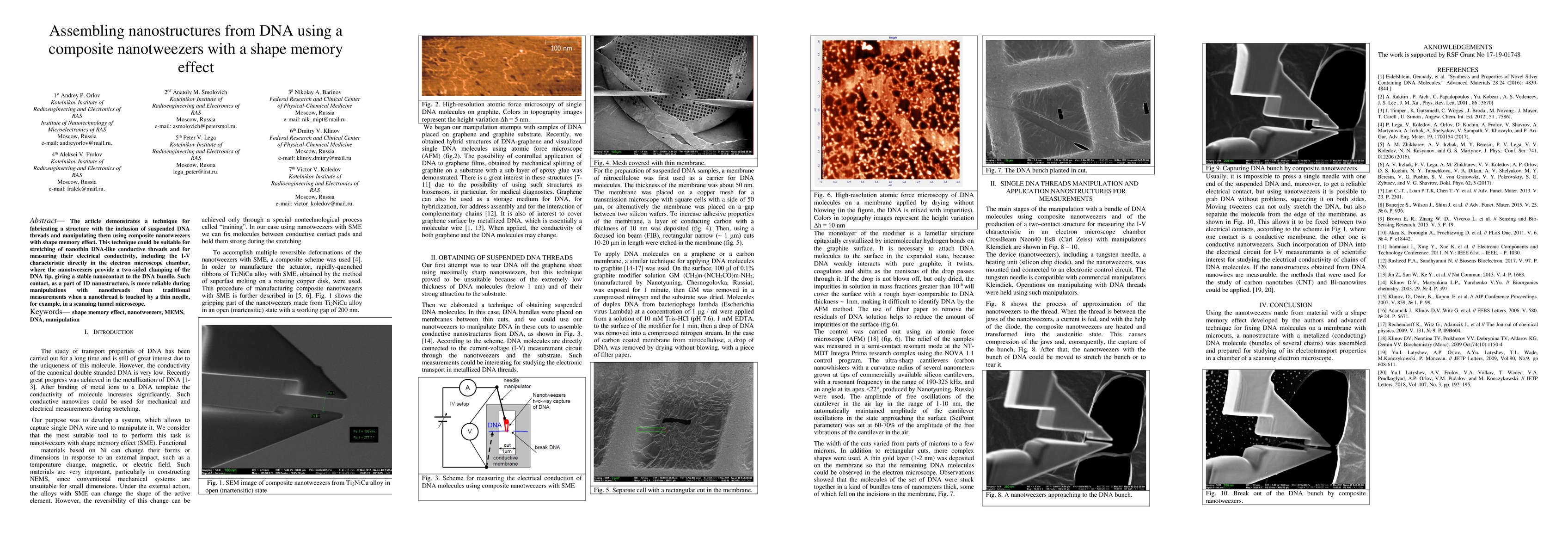 Researchers developed a technique to assemble nanostructures with DNA threads using composite nanotweezers that can stretch and manipulate the DNA like conductive threads. This method provides a stable nanocontact for measuring electrical conductivity of nanothreads directly in an electron microscope chamber.