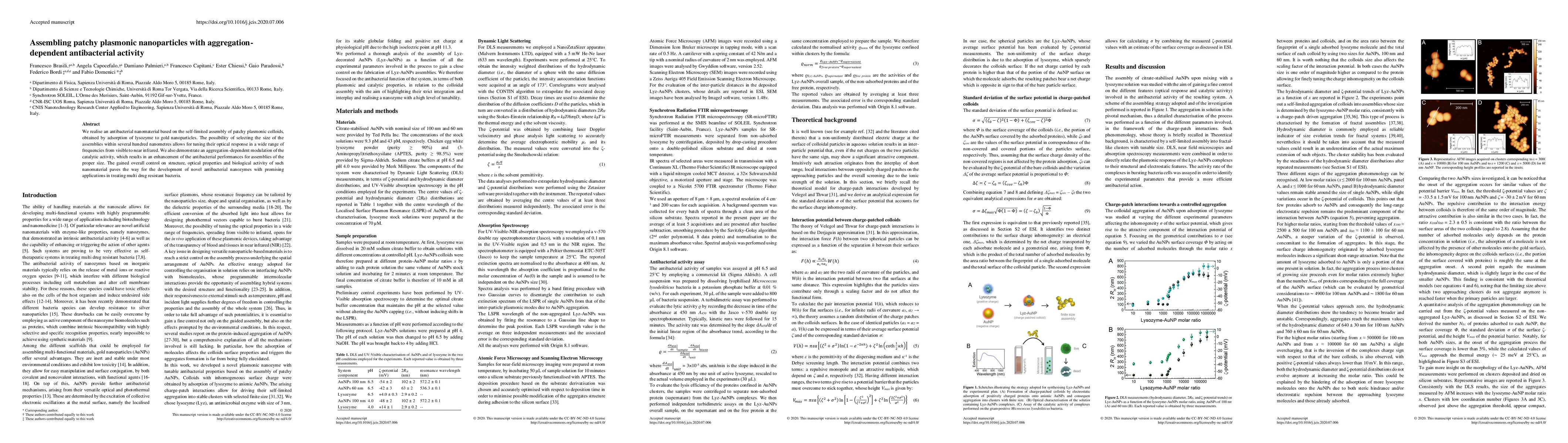 This paper presents an antibacterial nanomaterial made from self-limited assemblies of patchy plasmonic colloids, achieved by adsorbing lysozyme onto gold nanoparticles. The study shows that the size of these assemblies can be tuned to modulate their optical response and catalytic activity, leading to enhanced antibacterial performance for specific sizes.