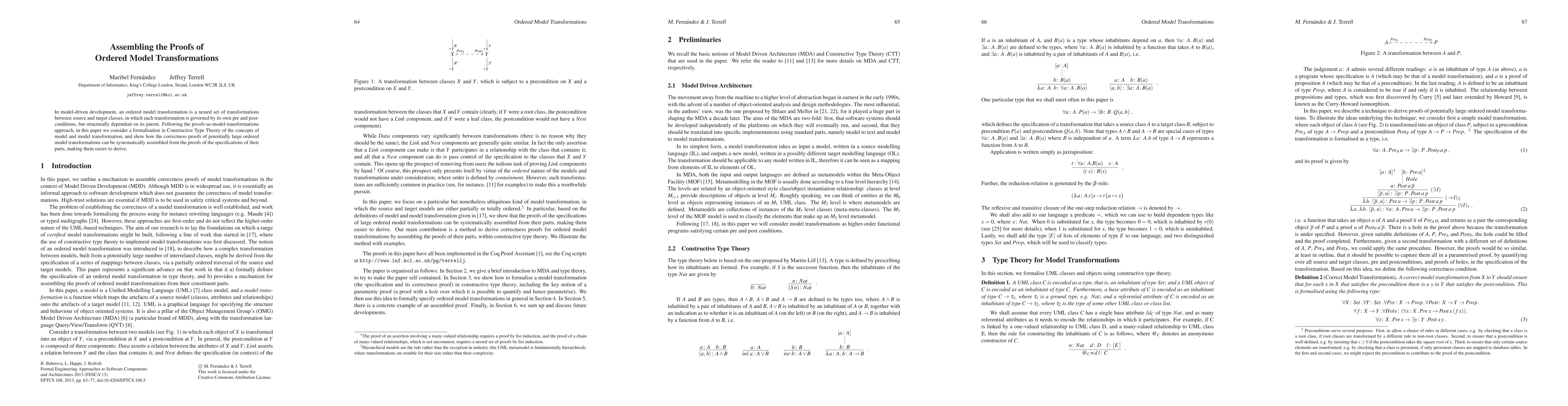 In model-driven development, an ordered model transformation is a nested set of transformations between source and target classes, in which each transformation is governed by its own pre and post- conditions, but structurally dependent on its parent. Following the proofs-as-model-transformations approach, in this paper we consider a formalisation in Constructive Type Theory of the concepts of model and model transformation, and show how the correctness proofs of potentially large ordered model transformations can be systematically assembled from the proofs of the specifications of their parts, making them easier to derive.