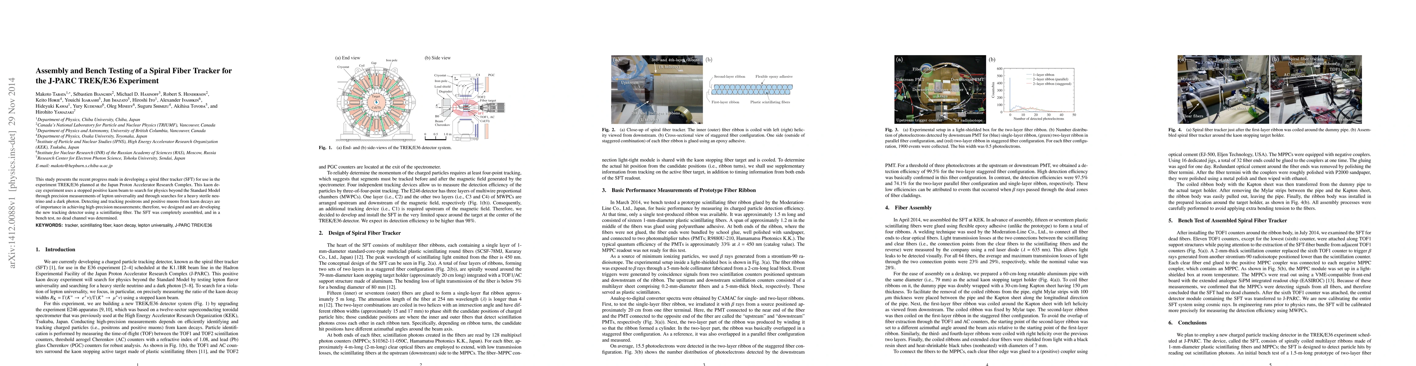 This study details the development and assembly of a spiral fiber tracker (SFT) for the TREK/E36 experiment at J-PARC, designed to detect and track positrons and muons in kaon decay experiments. The bench test confirmed the functionality of the SFT with no dead channels detected.