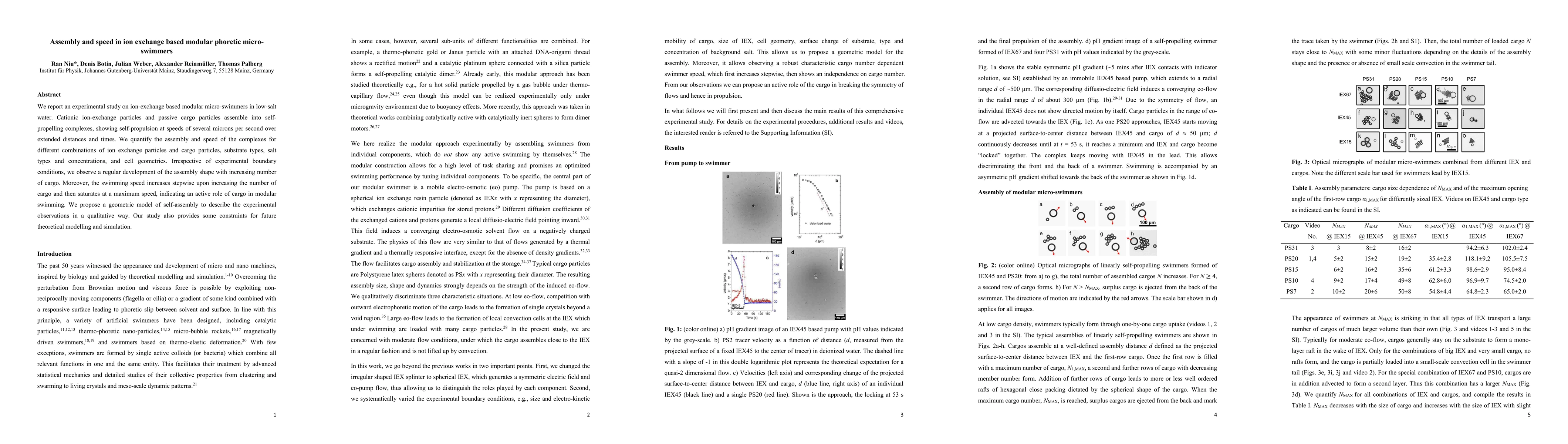 This paper investigates ion-exchange based modular micro-swimmers in low-salt water, demonstrating their self-propulsion and assembly into complexes. The study quantifies how assembly and speed vary with different particle combinations, substrate types, and salt conditions, revealing a stepwise increase in speed with cargo that saturates at a maximum, indicating cargo's active role in swimming.
