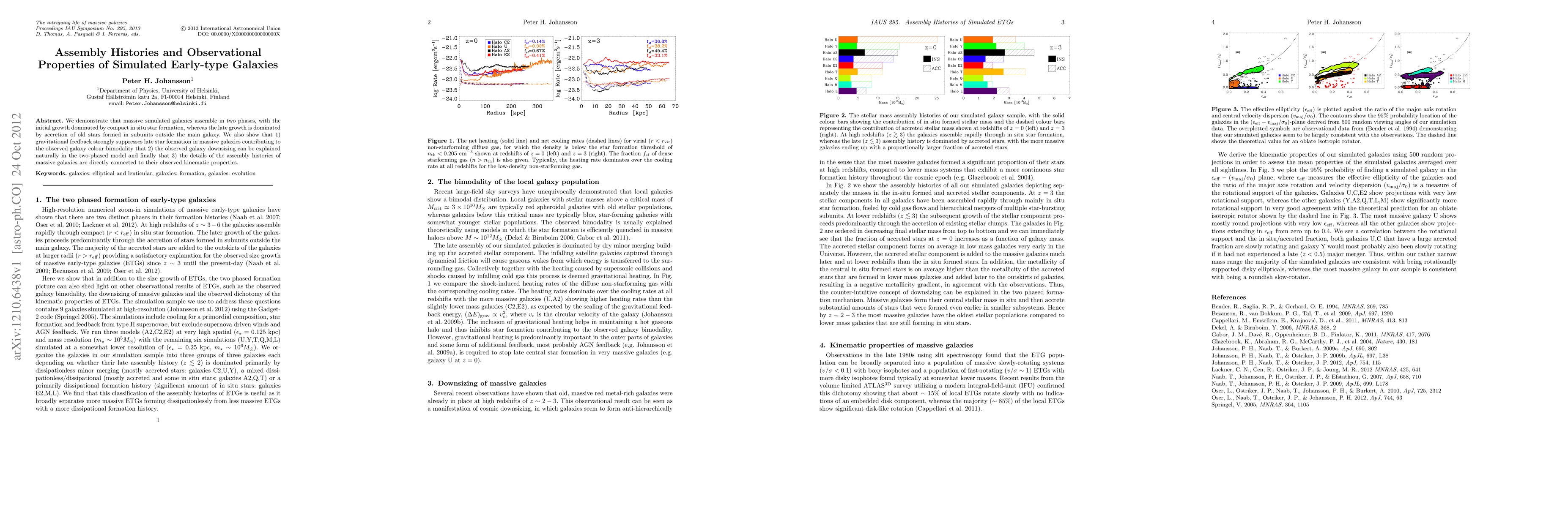 We demonstrate that massive simulated galaxies assemble in two phases, with the initial growth dominated by compact in situ star formation, whereas the late growth is dominated by accretion of old stars formed in subunits outside the main galaxy. We also show that 1) gravitational feedback strongly suppresses late star formation in massive galaxies contributing to the observed galaxy colour bimodality that 2) the observed galaxy downsizing can be explained naturally in the two-phased model and finally that 3) the details of the assembly histories of massive galaxies are directly connected to their observed kinematic properties.