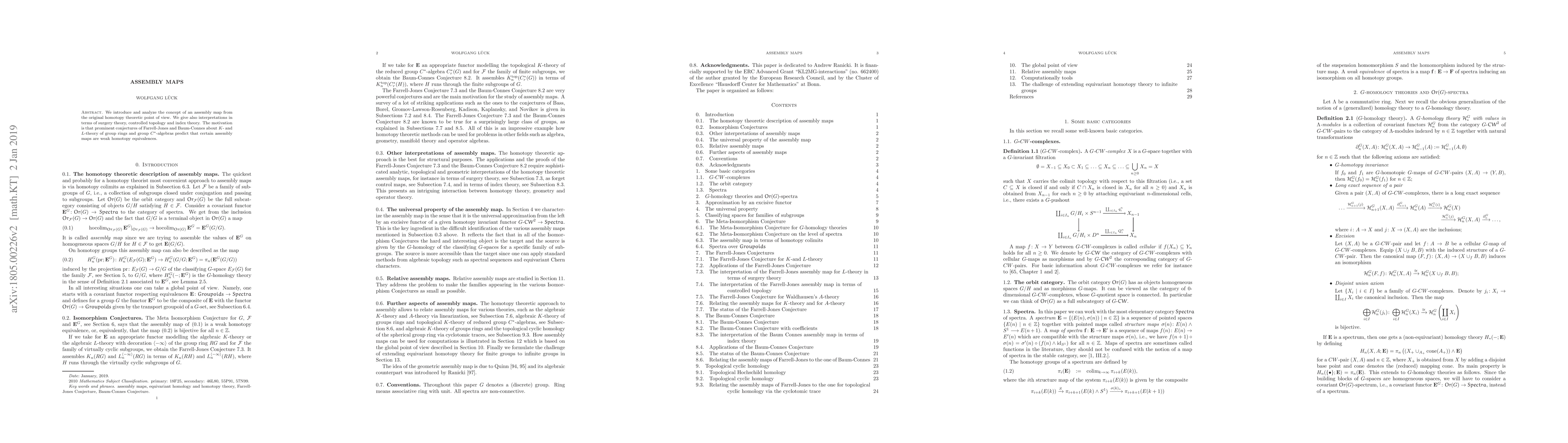 This paper introduces and examines assembly maps from a homotopy-theoretic perspective, providing interpretations in surgery theory, controlled topology, and index theory. The analysis is motivated by conjectures predicting that certain assembly maps are weak homotopy equivalences in the context of K- and L-theory of group rings and C^*-algebras.