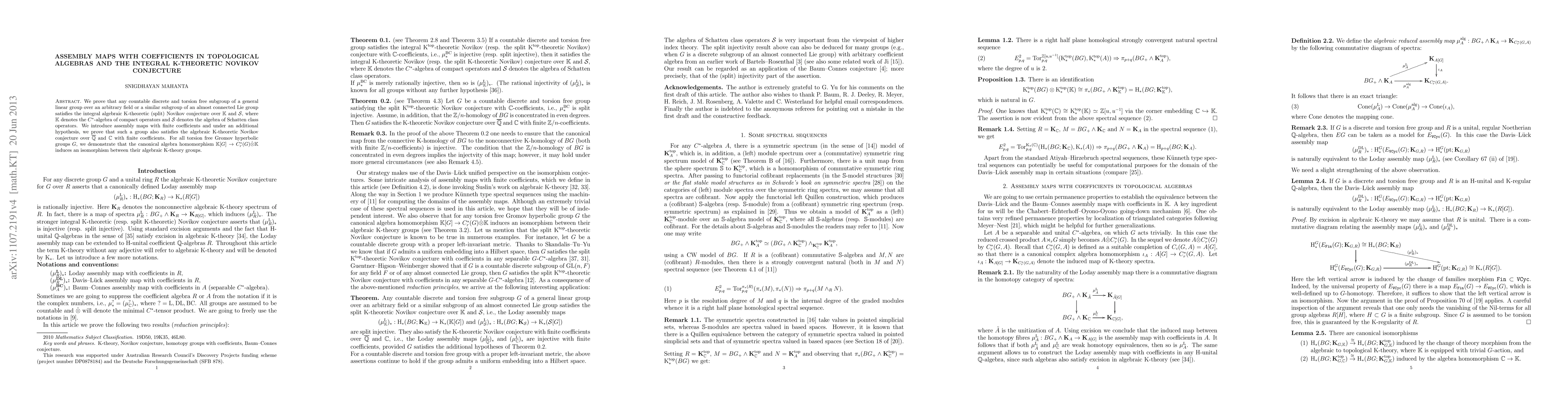 This paper proves the integral algebraic K-theoretic Novikov conjecture for countable, torsion-free subgroups of general linear groups over fields or almost connected Lie groups. It also introduces assembly maps with finite coefficients, showing they satisfy the algebraic K-theoretic Novikov conjecture over \bar{\mathbb{Q}} and \mathbb{C} under additional hypotheses.