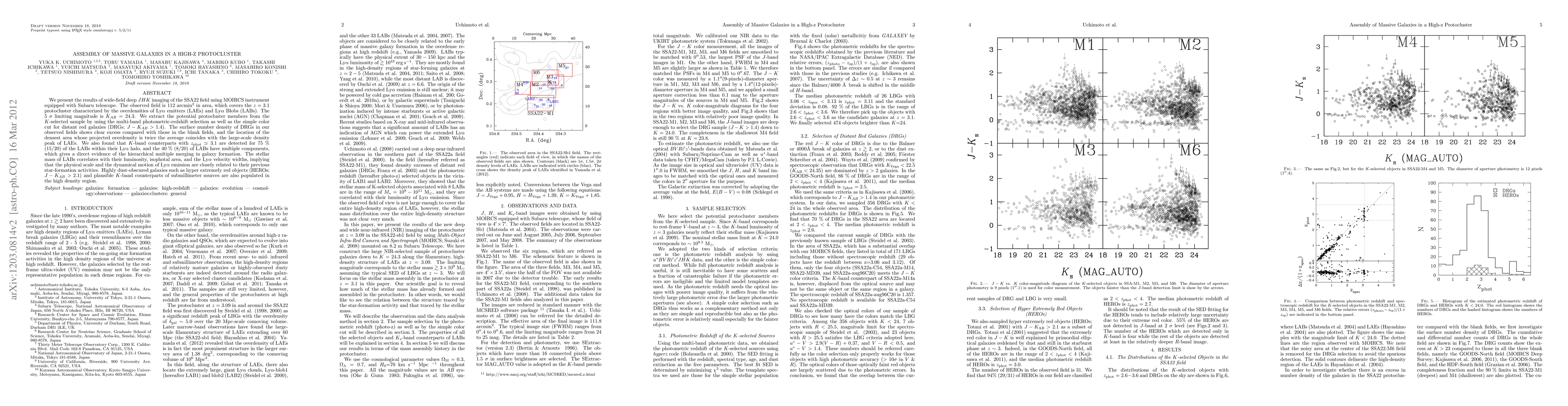 We present the results of wide-field deep JHK imaging of the SSA22 field using MOIRCS instrument equipped with Subaru telescope. The observed field is 112 arcmin^2 in area, which covers the z=3.1 protocluster characterized by the overdensities of Ly Alpha emitters (LAEs) and Ly Alpha Blobs (LABs). The 5 sigma limiting magnitude is K_{AB} = 24.3. We extract the potential protocluster members from the K-selected sample by using the multi-band photometric-redshift selection as well as the simple color cut for distant red galaxies (DRGs; J-K_{AB}>1.4). The surface number density of DRGs in our observed fields shows clear excess compared with those in the blank fields, and the location of the densest area whose projected overdensity is twice the average coincides with the large-scale density peak of LAEs. We also found that K-band counterparts with z_{phot} = 3.1 are detected for 75% (15/20) of the LABs within their Ly Alpha halo, and the 40 % (8/20) of LABs have multiple components, which gives a direct evidence of the hierarchical multiple merging in galaxy formation. The stellar mass ofLABs correlates with their luminosity, isophotal area, and the Ly Alpha velocity widths, implying that the physical scale and the dynamical motion of Ly Alpha emission are closely related to their previous star-formation activities. Highly dust-obscured galaxies such as hyper extremely red objects (HEROs; J-K_{AB}>2.1) and plausible K-band counterparts of submillimeter sources are also populated in the high density region.