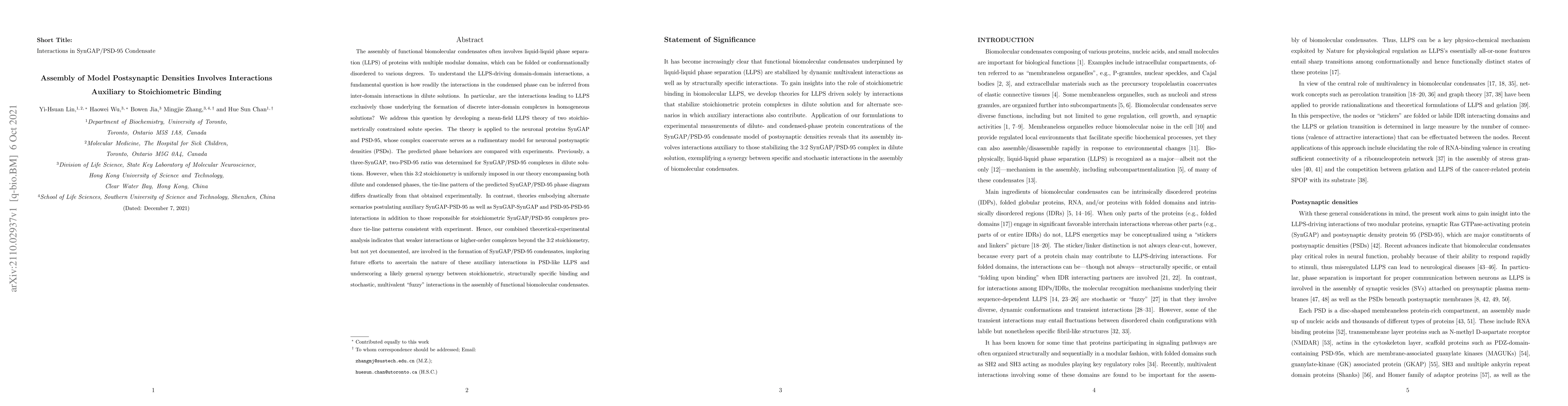 This research explores the formation of biomolecular condensates, like those in neuronal postsynaptic densities, using SynGAP and PSD-95 proteins as a model. The study finds that while stoichiometric interactions are present, additional weaker interactions or higher-order complexes are necessary for condensate formation, as theorized models without these auxiliary interactions fail to match experimental results.