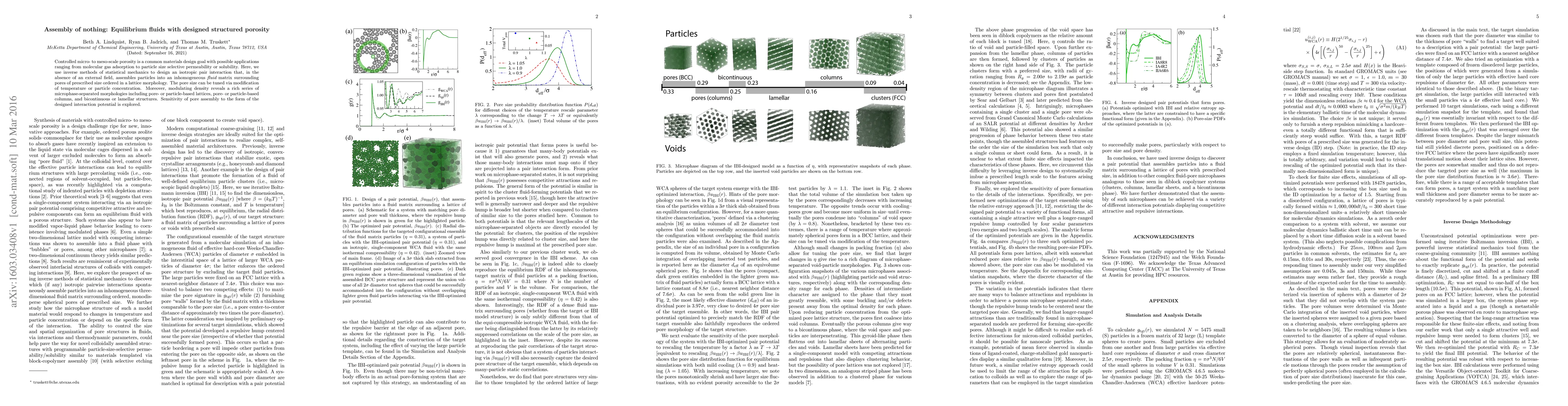 Controlled micro- to meso-scale porosity is a common materials design goal with possible applications ranging from molecular gas adsorption to particle size selective permeability or solubility. Here, we use inverse methods of statistical mechanics to design an isotropic pair interaction that, in the absence of an external field, assembles particles into an inhomogeneous {\em fluid} matrix surrounding pores of prescribed size ordered in a lattice morphology. The pore size can be tuned via modification of temperature or particle concentration. Moreover, modulating density reveals a rich series of microphase-separated morphologies including pore- or particle-based lattices, pore- or particle-based columns, and bicontinuous or lamellar structures. Sensitivity of pore assembly to the form of the designed interaction potential is explored.