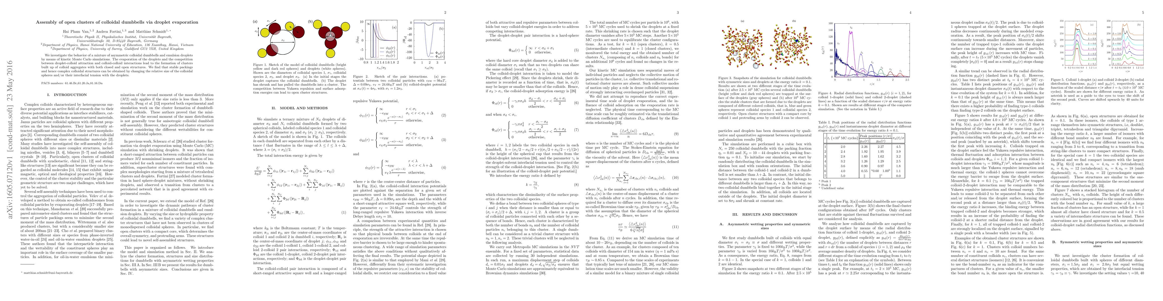 This study uses kinetic Monte Carlo simulations to explore the assembly of colloidal dumbbells into open clusters through droplet evaporation, revealing that stable packings and complex structures emerge by adjusting the size of the colloidal spheres or their interfacial tension with the droplets.
