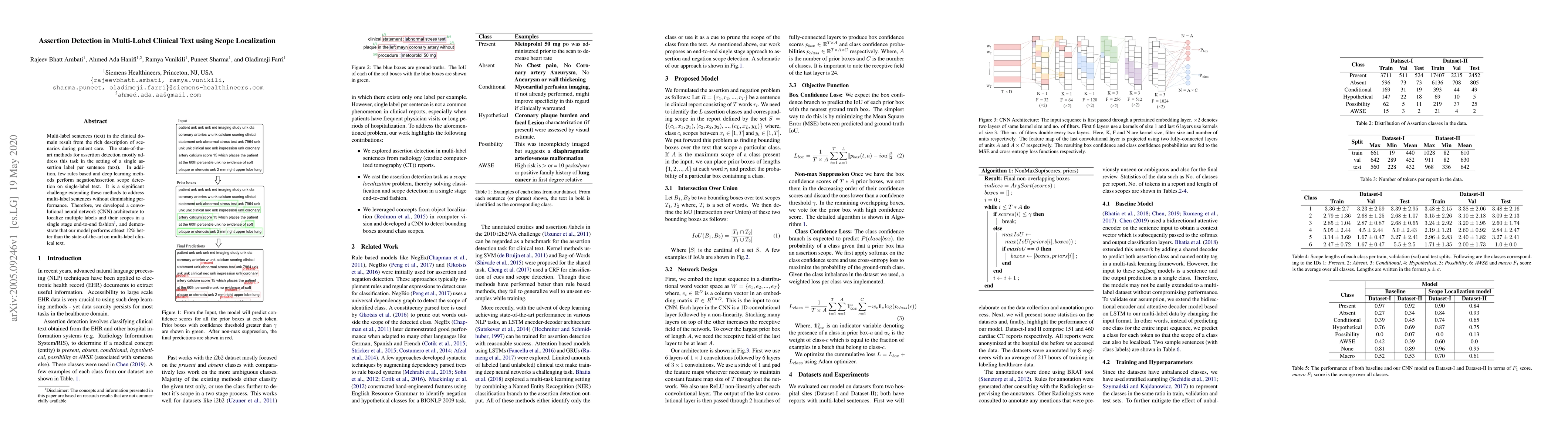 Multi-label sentences (text) in the clinical domain result from the rich description of scenarios during patient care. The state-of-theart methods for assertion detection mostly address this task in the setting of a single assertion label per sentence (text). In addition, few rules based and deep learning methods perform negation/assertion scope detection on single-label text. It is a significant challenge extending these methods to address multi-label sentences without diminishing performance. Therefore, we developed a convolutional neural network (CNN) architecture to localize multiple labels and their scopes in a single stage end-to-end fashion, and demonstrate that our model performs atleast 12% better than the state-of-the-art on multi-label clinical text.