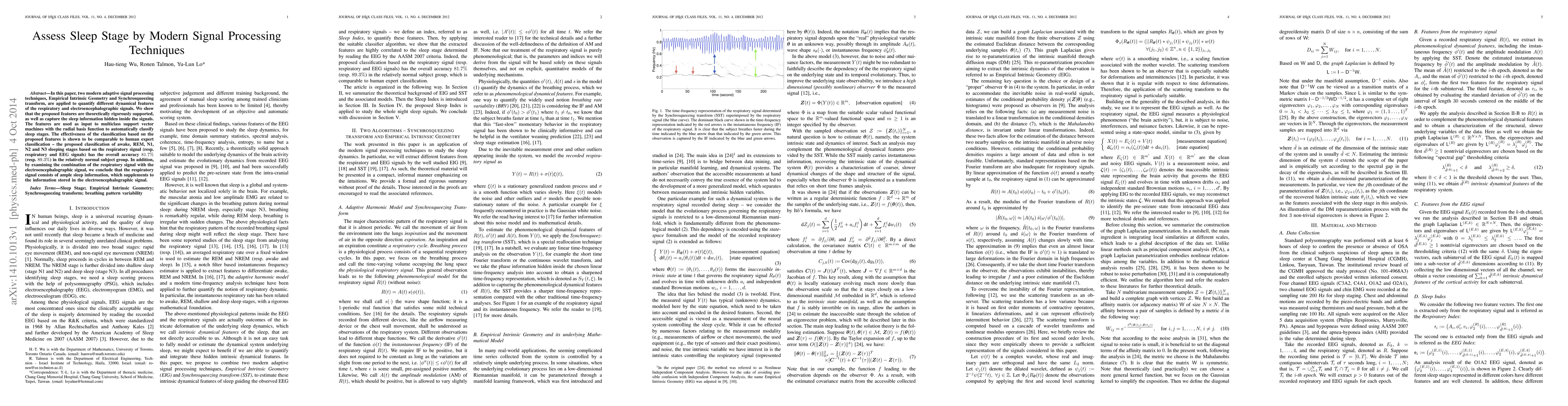 Researchers used modern signal processing techniques to analyze sleep stage data from respiratory and EEG signals, achieving accuracy comparable to human expert classification. They found that combining respiratory and EEG signals improves sleep information capture and can help diagnose sleep disorders.