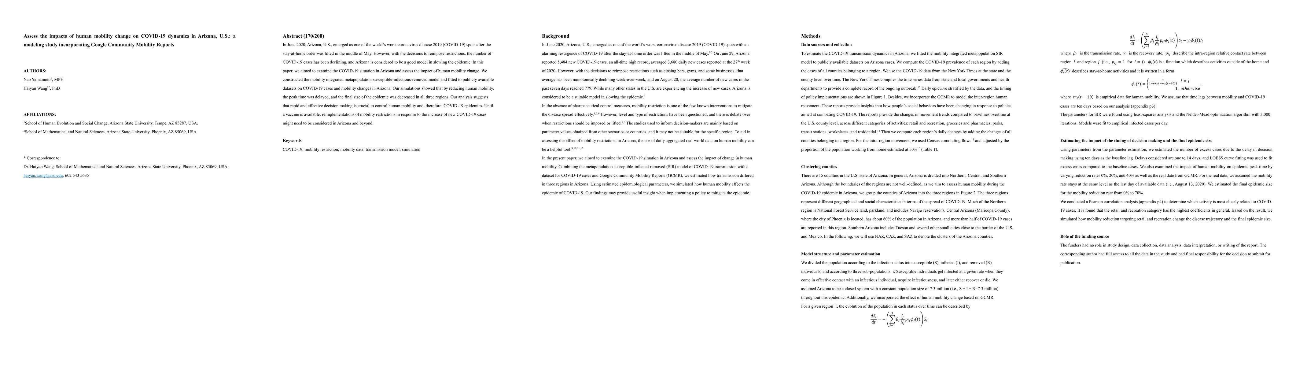 This study models the impact of human mobility changes on COVID-19 dynamics in Arizona using a metapopulation model integrated with Google Community Mobility Reports. Results indicate that reducing human mobility delays peak times and decreases the final size of the epidemic, highlighting the importance of effective decision-making in controlling the pandemic.