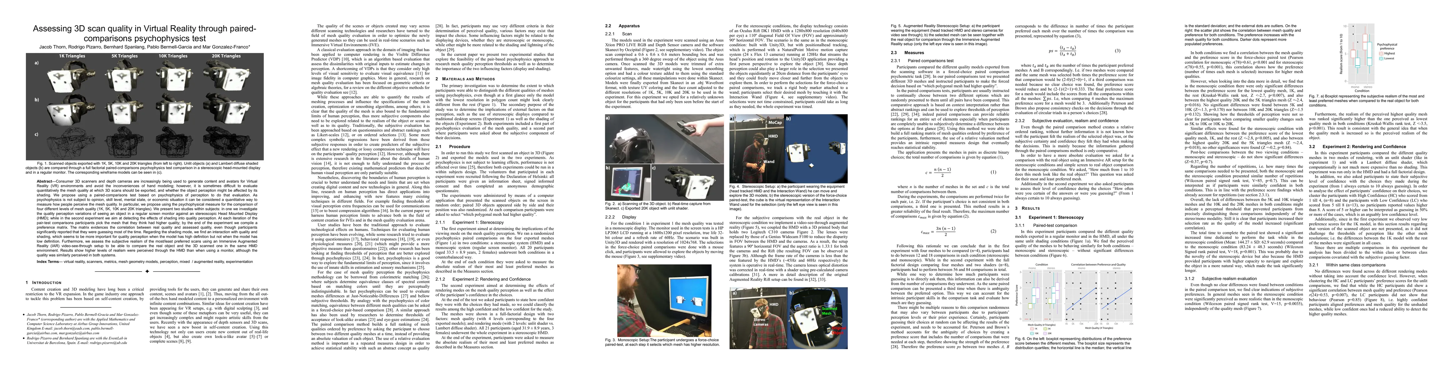 This research proposes a psychophysics-based paired-comparisons test to evaluate 3D scan quality for VR, comparing 1K, 5K, 10K, and 20K triangle meshes. Two studies within subjects reveal that higher quality meshes are perceived as more realistic in HMD than on monitors, and that shading impacts quality perception, especially with high-definition models.