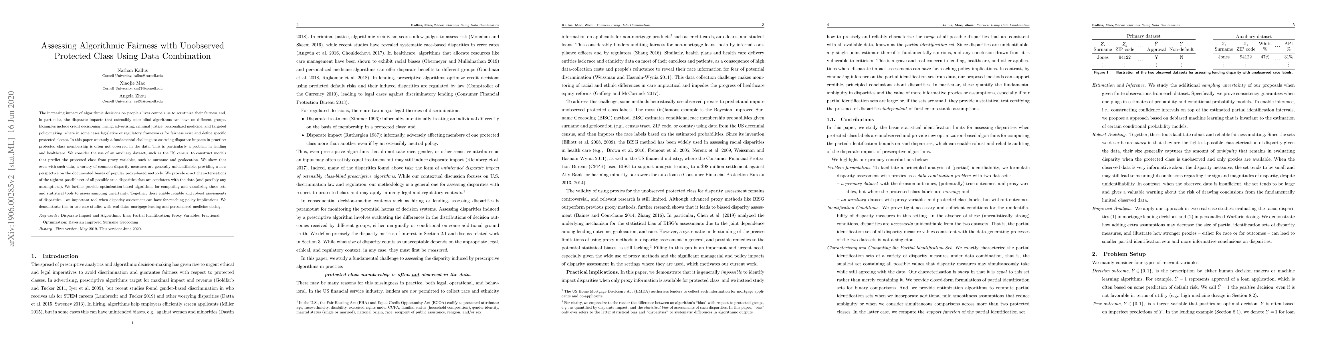 This paper explores the challenge of assessing algorithmic fairness when protected class membership is unobserved in data, proposing methods to combine auxiliary datasets to predict protected classes using proxy variables. It introduces optimization algorithms and statistical tools for reliable disparity assessments, demonstrated through mortgage lending and personalized medicine dosing case studies.