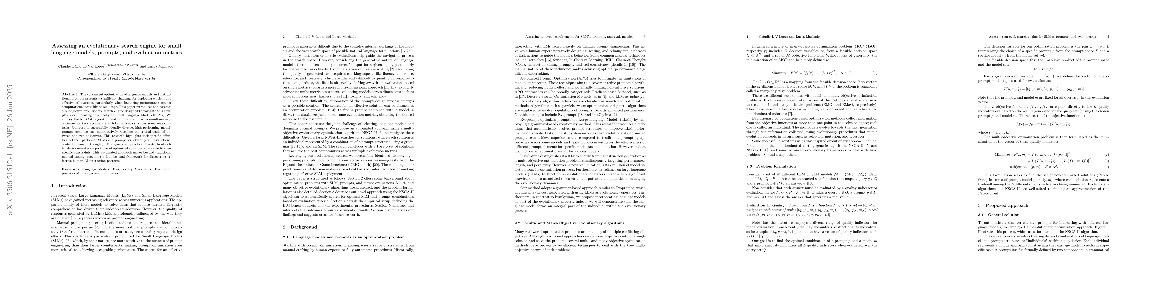 The concurrent optimization of language models and instructional prompts presents a significant challenge for deploying efficient and effective AI systems, particularly when balancing performance against computational costs like token usage. This paper introduces and assesses a bi-objective evolutionary search engine designed to navigate this complex space, focusing specifically on Small Language Models (SLMs). We employ the NSGA-II algorithm and prompt grammar to simultaneously optimize for task accuracy and token efficiency across some reasoning tasks. Our results successfully identify diverse, high-performing model-prompt combinations, quantitatively revealing the critical trade-off between the two objectives. This research highlights task-specific affinities between particular SLMs and prompt structures (e.g., instructions, context, chain of thought). The generated practical Pareto fronts offer decision-makers a portfolio of optimized solutions adaptable to their specific constraints. This automated approach moves beyond traditional manual tuning, providing a foundational framework for discovering effective human-AI interaction patterns.