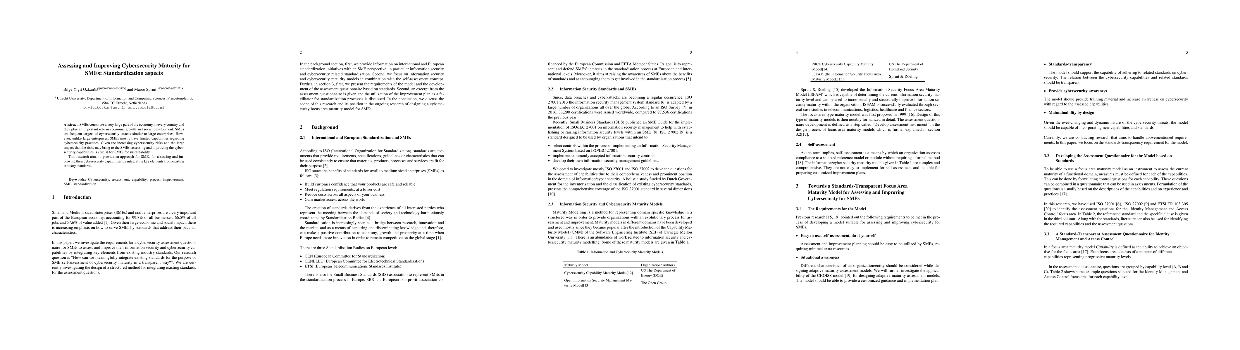 SMEs constitute a very large part of the economy in every country and they play an important role in economic growth and social development. SMEs are frequent targets of cybersecurity attacks similar to large enterprises. However, unlike large enterprises, SMEs mostly have limited capabilities regarding cybersecurity practices. Given the increasing cybersecurity risks and the large impact that the risks may bring to the SMEs, assessing and improving the cybersecurity capabilities is crucial for SMEs for sustainability. This research aims to provide an approach for SMEs for assessing and improving their cybersecurity capabilities by integrating key elements from existing industry standards.