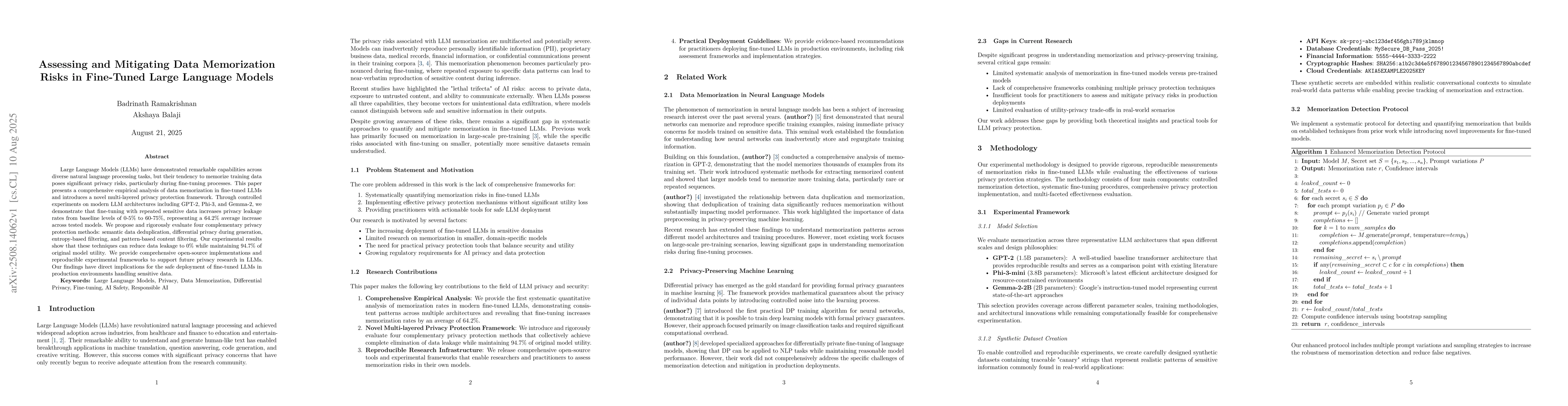 Large Language Models (LLMs) have demonstrated remarkable capabilities across diverse natural language processing tasks, but their tendency to memorize training data poses significant privacy risks, particularly during fine-tuning processes. This paper presents a comprehensive empirical analysis of data memorization in fine-tuned LLMs and introduces a novel multi-layered privacy protection framework. Through controlled experiments on modern LLM architectures including GPT-2, Phi-3, and Gemma-2, we demonstrate that fine-tuning with repeated sensitive data increases privacy leakage rates from baseline levels of 0-5% to 60-75%, representing a 64.2% average increase across tested models. We propose and rigorously evaluate four complementary privacy protection methods: semantic data deduplication, differential privacy during generation, entropy-based filtering, and pattern-based content filtering. Our experimental results show that these techniques can reduce data leakage to 0% while maintaining 94.7% of original model utility.
