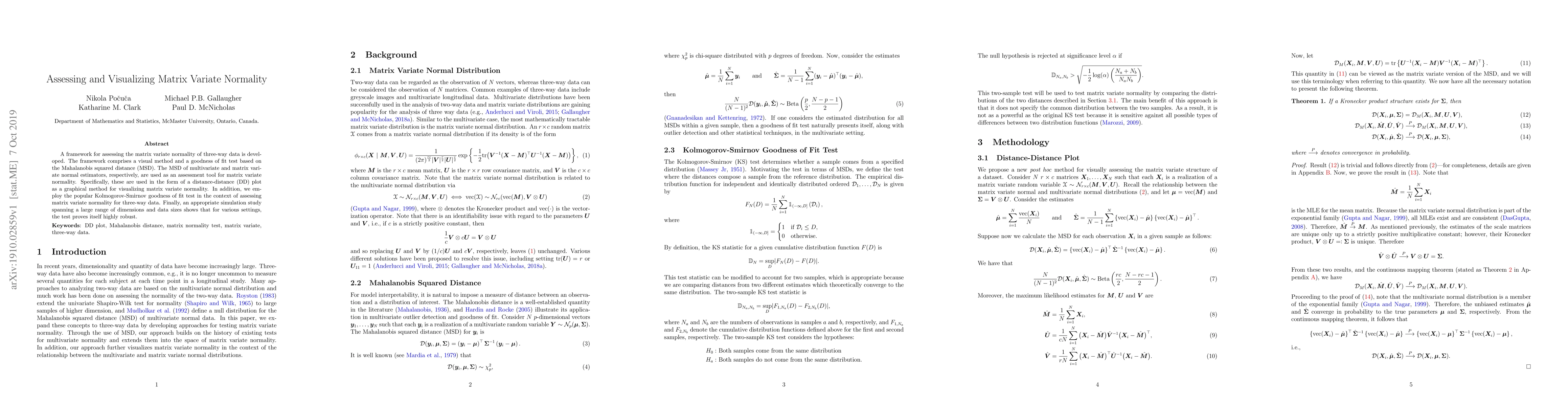 A framework for assessing the matrix variate normality of three-way data is developed. The framework comprises a visual method and a goodness of fit test based on the Mahalanobis squared distance (MSD). The MSD of multivariate and matrix variate normal estimators, respectively, are used as an assessment tool for matrix variate normality. Specifically, these are used in the form of a distance-distance (DD) plot as a graphical method for visualizing matrix variate normality. In addition, we employ the popular Kolmogorov-Smirnov goodness of fit test in the context of assessing matrix variate normality for three-way data. Finally, an appropriate simulation study spanning a large range of dimensions and data sizes shows that for various settings, the test proves itself highly robust.
