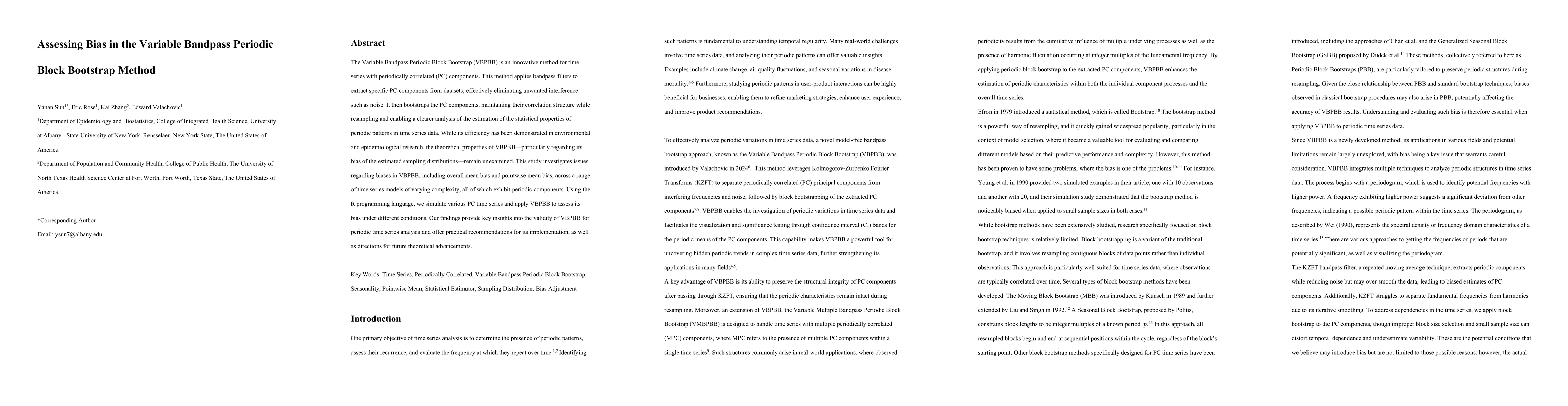 The Variable Bandpass Periodic Block Bootstrap(VBPBB) is an innovative method for time series with periodically correlated(PC) components. This method applies bandpass filters to extract specific PC components from datasets, effectively eliminating unwanted interference such as noise. It then bootstraps the PC components, maintaining their correlation structure while resampling and enabling a clearer analysis of the estimation of the statistical properties of periodic patterns in time series data. While its efficiency has been demonstrated in environmental and epidemiological research, the theoretical properties of VBPBB, particularly regarding its bias of the estimated sampling distributions, remain unexamined. This study investigates issues regarding biases in VBPBB, including overall mean bias and pointwise mean bias, across a range of time series models of varying complexity, all of which exhibit periodic components. Using the R programming language, we simulate various PC time series and apply VBPBB to assess its bias under different conditions. Our findings provide key insights into the validity of VBPBB for periodic time series analysis and offer practical recommendations for its implementation, as well as directions for future theoretical advancements.