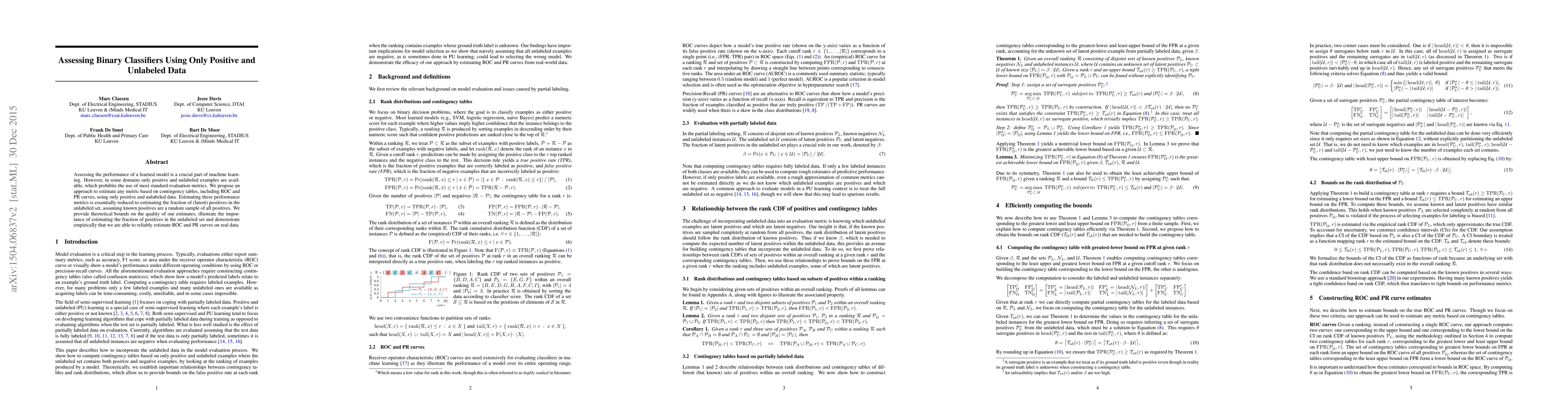 This paper proposes a method to estimate performance metrics like ROC and PR curves using only positive and unlabeled data, by estimating the fraction of positives in unlabeled samples. It provides theoretical bounds on the accuracy of these estimates and demonstrates their reliability on real datasets.