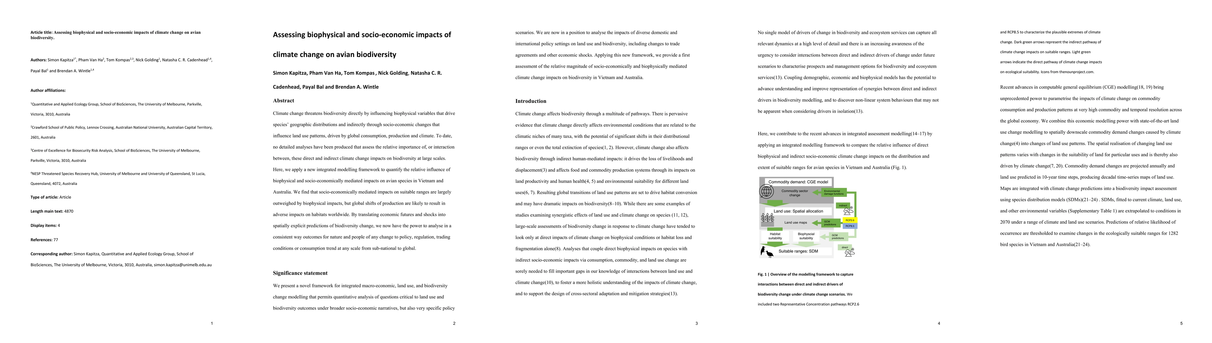 This paper uses an integrated modelling framework to assess the relative impacts of biophysical and socio-economic changes driven by climate change on avian biodiversity in Vietnam and Australia. It finds that while socio-economic changes have less impact on avian suitable ranges than biophysical changes, global production shifts could lead to significant habitat degradation worldwide.