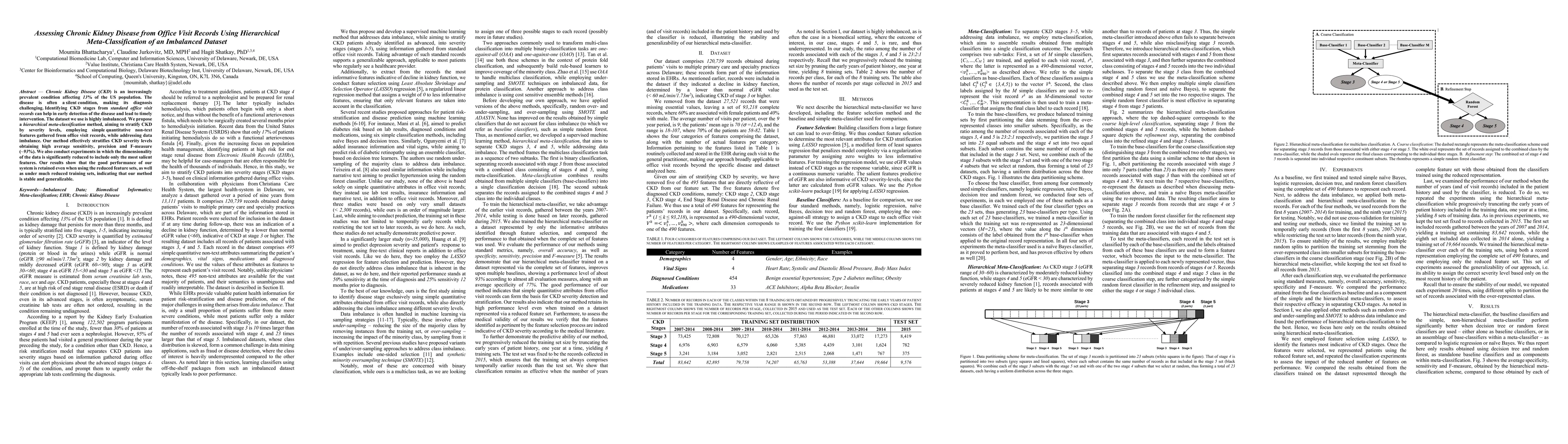 Chronic Kidney Disease (CKD) is an increasingly prevalent condition affecting 13% of the US population. The disease is often a silent condition, making its diagnosis challenging. Identifying CKD stages from standard office visit records can help in early detection of the disease and lead to timely intervention. The dataset we use is highly imbalanced. We propose a hierarchical meta-classification method, aiming to stratify CKD by severity levels, employing simple quantitative non-text features gathered from office visit records, while addressing data imbalance. Our method effectively stratifies CKD severity levels obtaining high average sensitivity, precision and F-measure (~93%). We also conduct experiments in which the dimensionality of the data is significantly reduced to include only the most salient features. Our results show that the good performance of our system is retained even when using the reduced feature sets, as well as under much reduced training sets, indicating that our method is stable and generalizable.