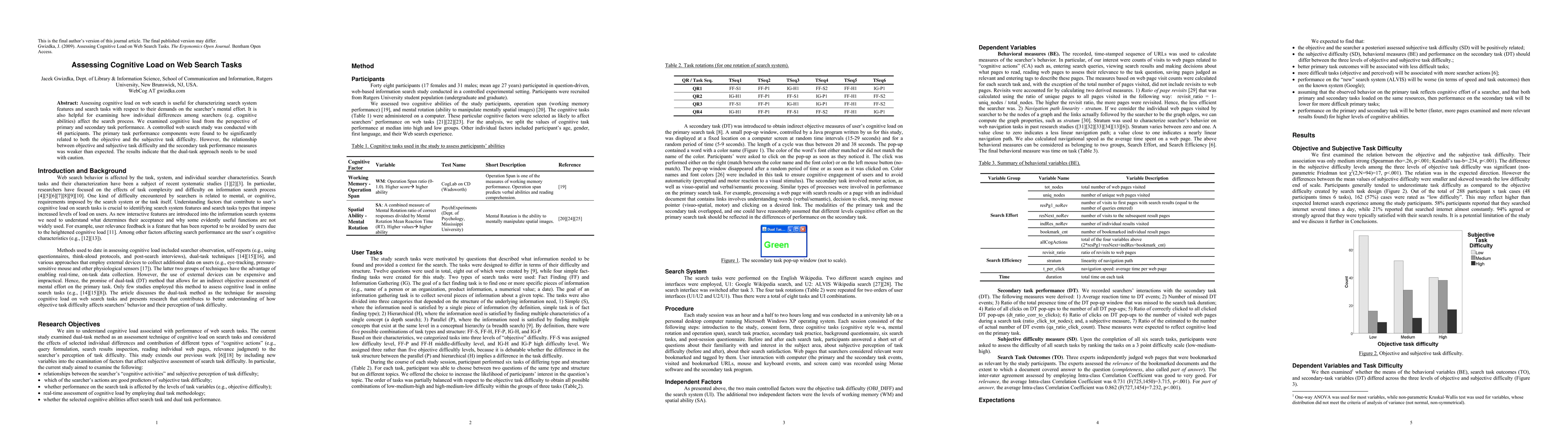 This study assesses cognitive load during web search tasks, finding that primary task performance correlates with both objective and subjective task difficulty. The relationship between these factors and secondary task performance was weaker than anticipated, suggesting caution in using dual-task approaches for cognitive load assessment.