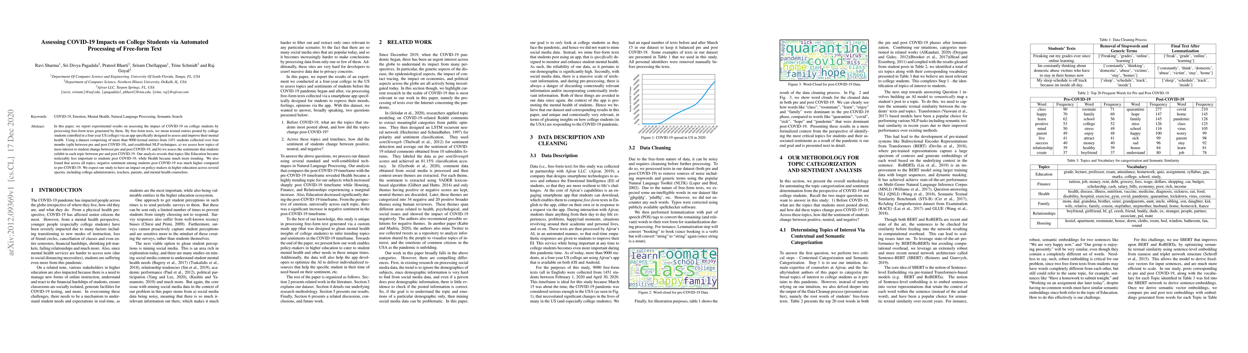 In this paper, we report experimental results on assessing the impact of COVID-19 on college students by processing free-form texts generated by them. By free-form texts, we mean textual entries posted by college students (enrolled in a four year US college) via an app specifically designed to assess and improve their mental health. Using a dataset comprising of more than 9000 textual entries from 1451 students collected over four months (split between pre and post COVID-19), and established NLP techniques, a) we assess how topics of most interest to student change between pre and post COVID-19, and b) we assess the sentiments that students exhibit in each topic between pre and post COVID-19. Our analysis reveals that topics like Education became noticeably less important to students post COVID-19, while Health became much more trending. We also found that across all topics, negative sentiment among students post COVID-19 was much higher compared to pre-COVID-19. We expect our study to have an impact on policy-makers in higher education across several spectra, including college administrators, teachers, parents, and mental health counselors.