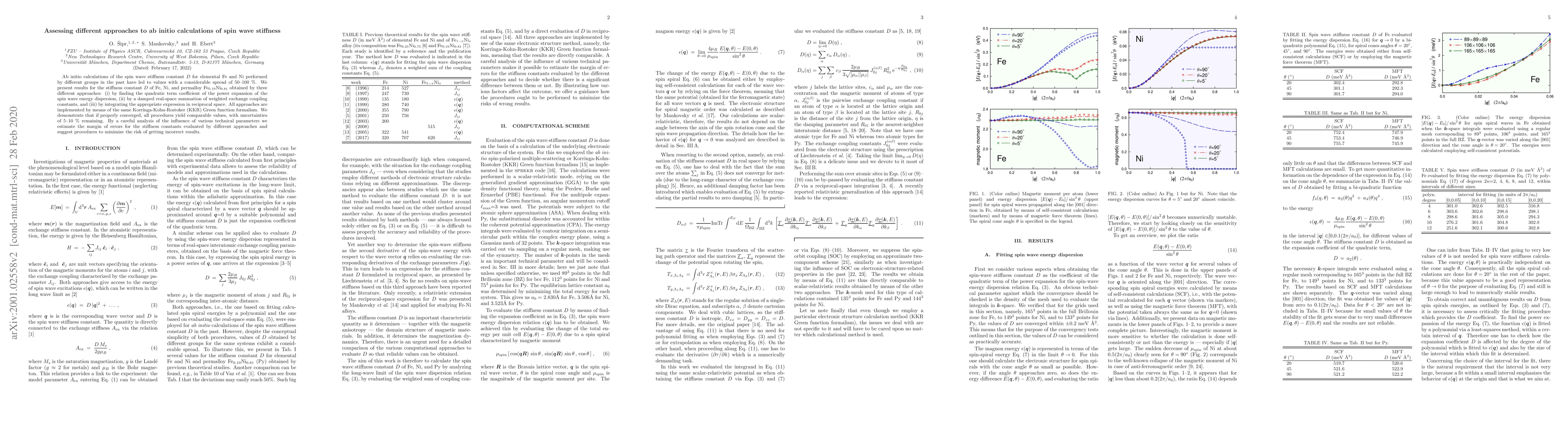 This paper evaluates the spin wave stiffness constant $D$ for Fe, Ni, and Fe$_{0.19}$Ni$_{0.81}$ using three ab initio approaches, showing that while results vary, proper convergence yields comparable values with minor uncertainties. The study identifies technical parameters affecting accuracy and proposes methods to minimize errors.