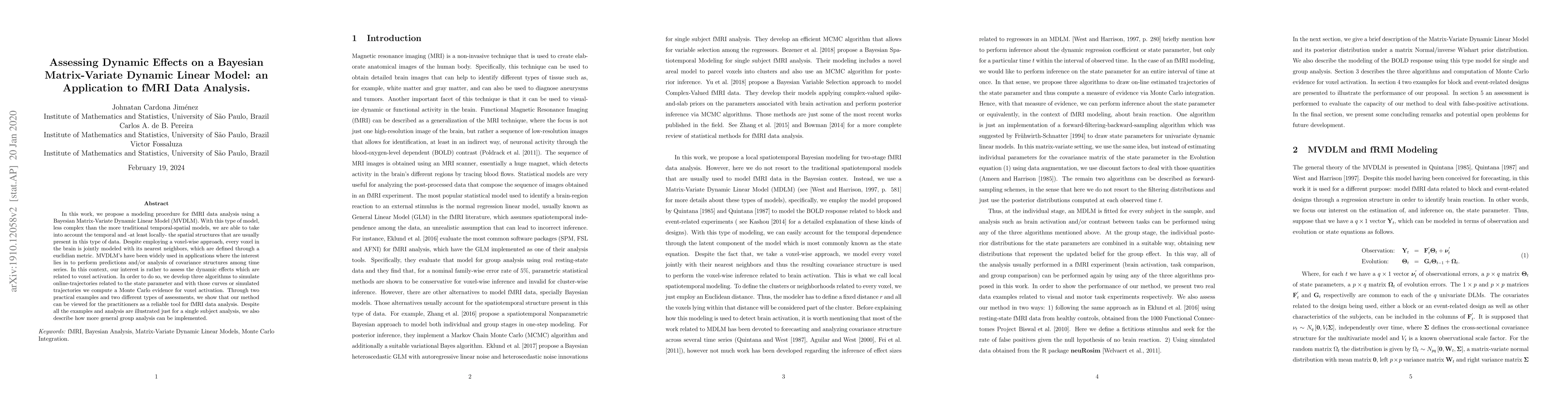 This paper proposes a Bayesian Matrix-Variate Dynamic Linear Model (MVDLM) for fMRI data analysis, enabling joint modeling of voxels with their neighbors to capture temporal and spatial structures. The authors develop algorithms to assess dynamic effects related to voxel activation, demonstrating the method's reliability through practical examples and assessments.