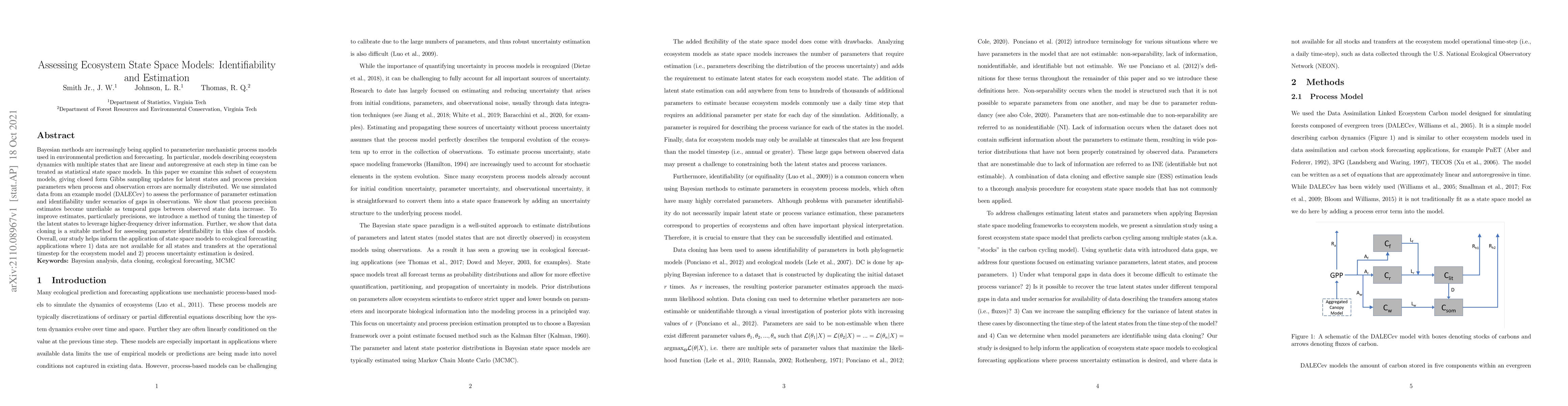 Bayesian methods are increasingly being applied to parameterize mechanistic process models used in environmental prediction and forecasting. In particular, models describing ecosystem dynamics with multiple states that are linear and autoregressive at each step in time can be treated as statistical state space models. In this paper we examine this subset of ecosystem models, giving closed form Gibbs sampling updates for latent states and process precision parameters when process and observation errors are normally distributed. We use simulated data from an example model (DALECev) to assess the performance of parameter estimation and identifiability under scenarios of gaps in observations. We show that process precision estimates become unreliable as temporal gaps between observed state data increase. To improve estimates, particularly precisions, we introduce a method of tuning the timestep of the latent states to leverage higher-frequency driver information. Further, we show that data cloning is a suitable method for assessing parameter identifiability in this class of models. Overall, our study helps inform the application of state space models to ecological forecasting applications where 1) data are not available for all states and transfers at the operational timestep for the ecosystem model and 2) process uncertainty estimation is desired.