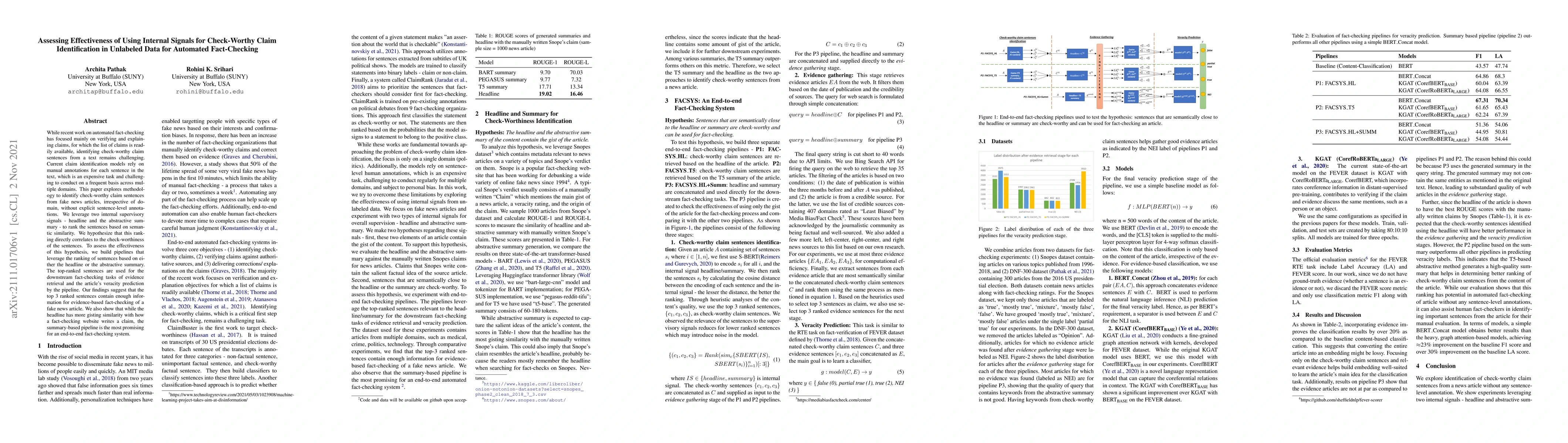 This research develops a methodology to identify check-worthy claims in unlabeled text data using internal signals like headlines and summaries, without manual annotations. It finds that the top-ranked sentences based on semantic similarity to these signals are sufficient for fact-checking, with summary-based ranking showing the most promise for a comprehensive fact-checking system.