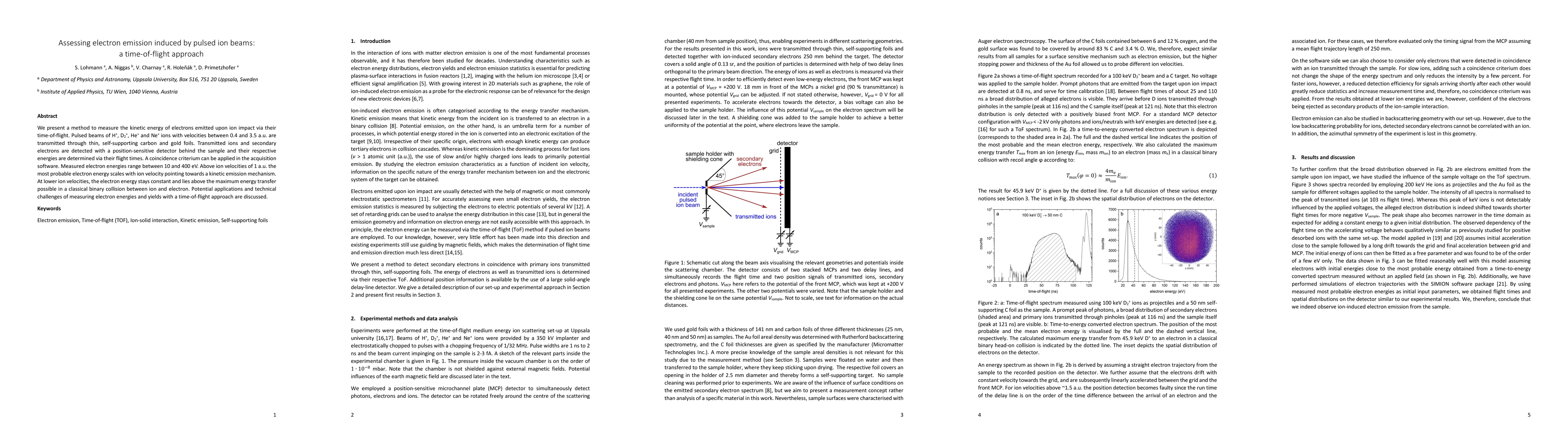 This paper introduces a time-of-flight method to measure electron kinetic energy from pulsed ion beams impacting carbon and gold foils, revealing a kinetic emission mechanism at higher ion velocities. The study discusses potential applications and technical challenges of this approach.