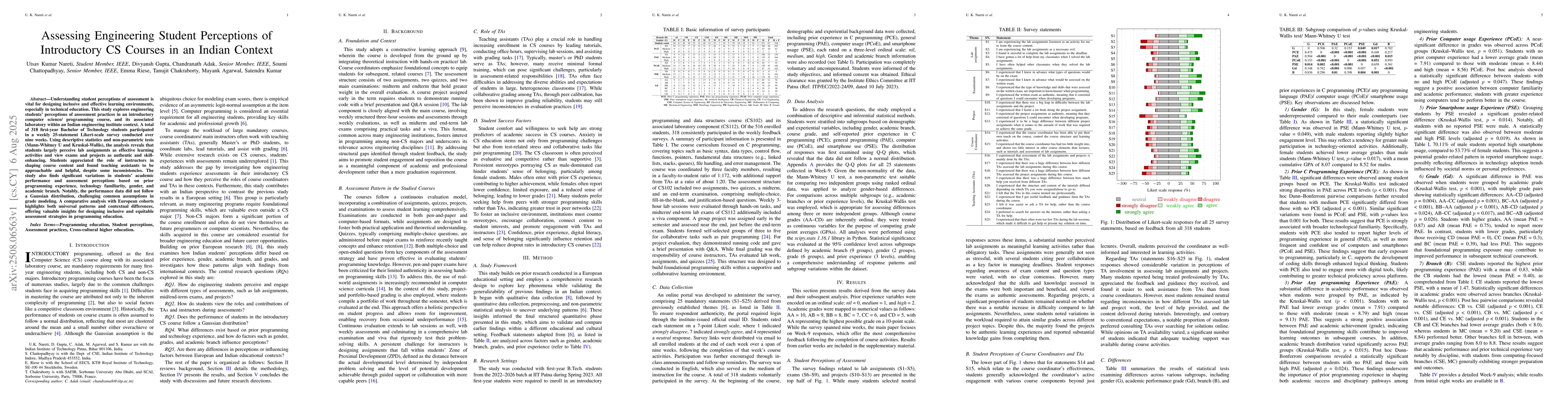 Understanding student perceptions of assessment is vital for designing inclusive and effective learning environments, especially in technical education. This study explores engineering students' perceptions of assessment practices in an introductory computer science/ programming course, and its associated laboratory within an Indian engineering institute context. A total of 318 first-year Bachelor of Technology students participated in a weekly 25-statement Likert-scale survey conducted over nine weeks. Using descriptive statistics and non-parametric tests (Mann-Whitney U and Kruskal-Wallis), the analysis reveals that students largely perceive lab assignments as effective learning activities and view exams and projects as authentic and skill-enhancing. Students appreciated the role of instructors in shaping course content and found teaching assistants to be approachable and helpful, despite some inconsistencies. The study also finds significant variations in students' academic performance and assessment perceptions based on prior programming experience, technology familiarity, gender, and academic branch. Notably, the performance data did not follow a Gaussian distribution, challenging common assumptions in grade modeling. A comparative analysis with European cohorts highlights both universal patterns and contextual differences, offering valuable insights for designing inclusive and equitable assessment strategies in programming education.