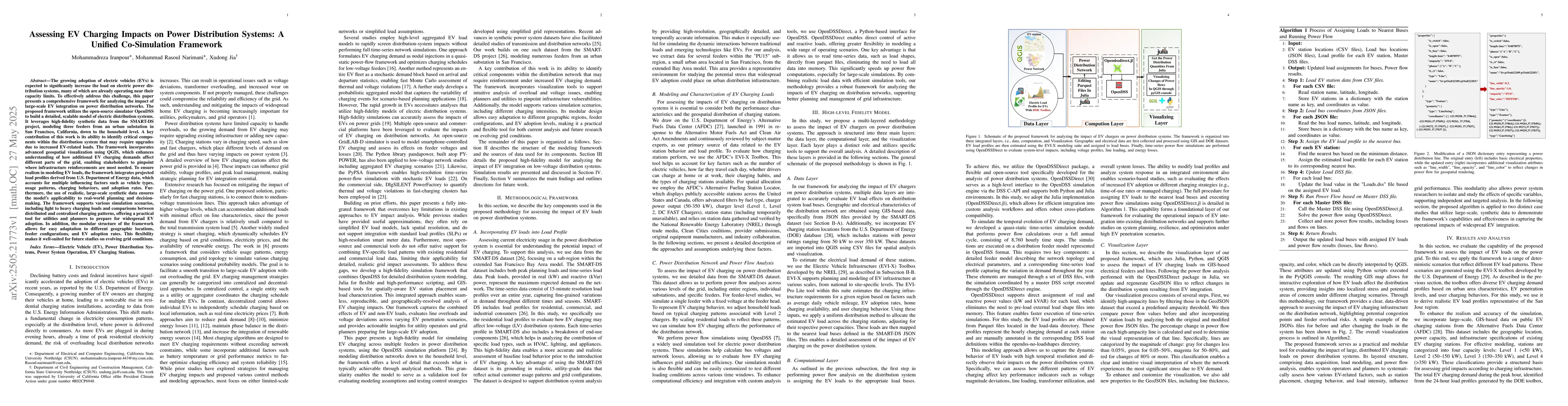 The framework's use of synthetic data for detailed, geospatially-resolved EV load modeling, combined with OpenDSS and QGIS, offers a novel approach to grid impact analysis.