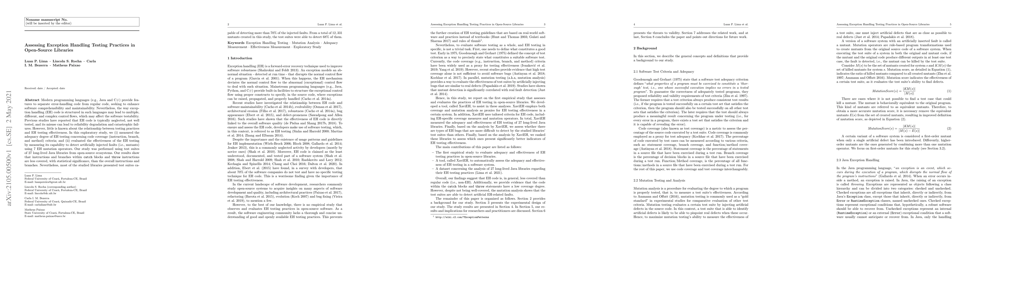Research assesses testing practices for exception handling in open-source libraries, finding that 70% of test suites can detect over 60% of injected faults, with most issues in catch blocks and throw instructions.