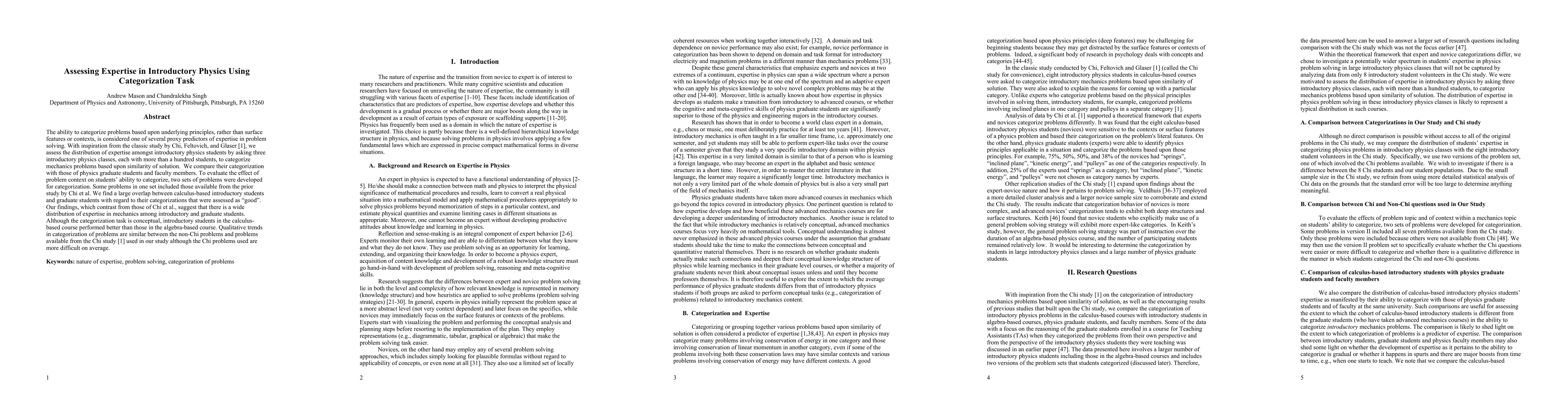 This study assesses expertise in introductory physics by having students categorize mechanics problems based on underlying principles, comparing their categorizations to those of graduate students and faculty. Results show a significant overlap in "good" categorizations between calculus-based students and graduate students, indicating a wide distribution of expertise among both groups.
