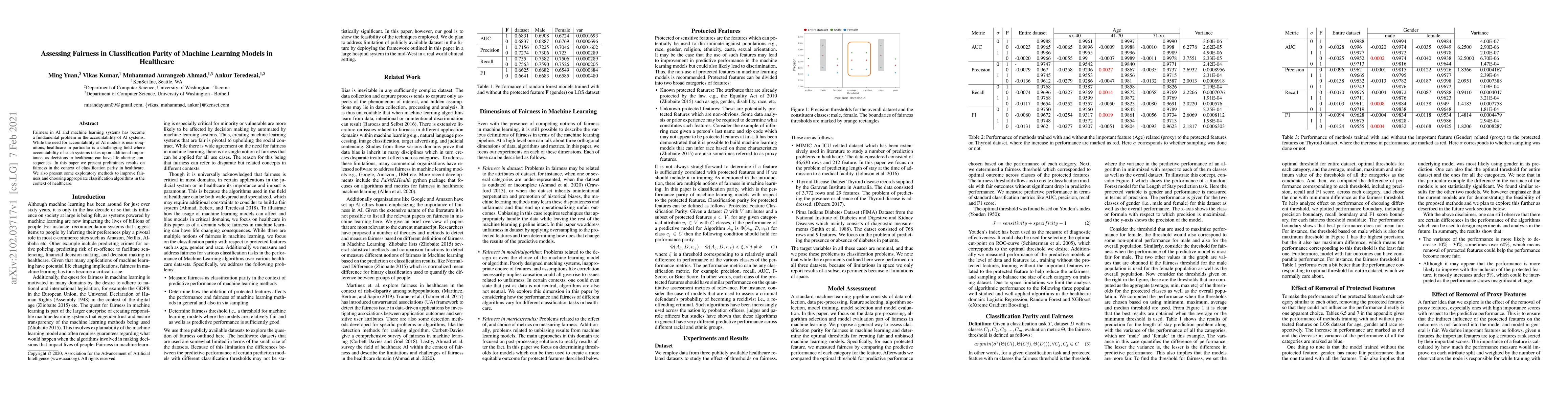 Fairness in AI and machine learning systems has become a fundamental problem in the accountability of AI systems. While the need for accountability of AI models is near ubiquitous, healthcare in particular is a challenging field where accountability of such systems takes upon additional importance, as decisions in healthcare can have life altering consequences. In this paper we present preliminary results on fairness in the context of classification parity in healthcare. We also present some exploratory methods to improve fairness and choosing appropriate classification algorithms in the context of healthcare.