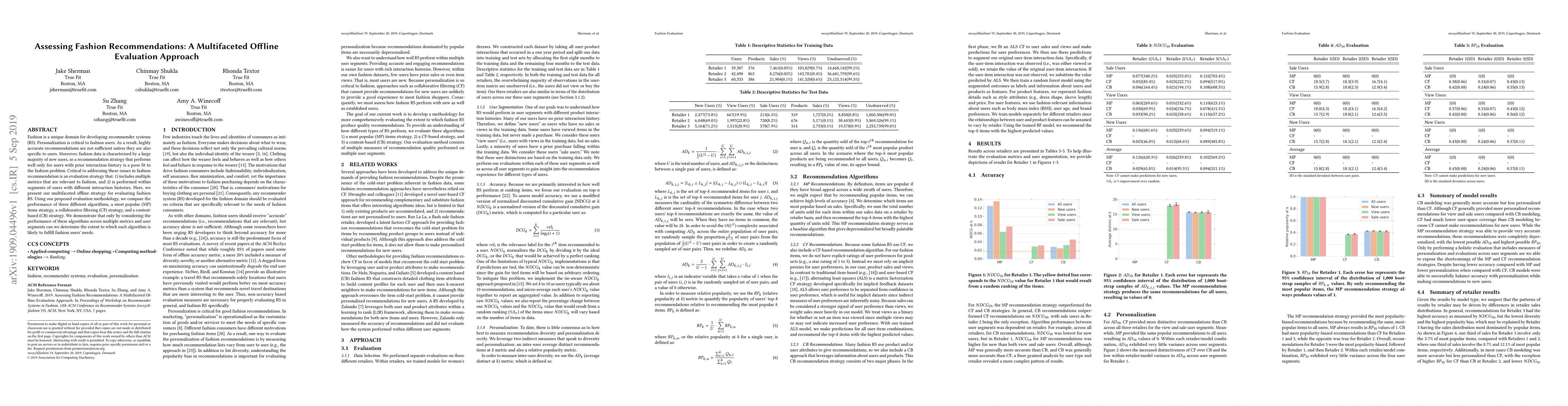 Fashion is a unique domain for developing recommender systems (RS). Personalization is critical to fashion users. As a result, highly accurate recommendations are not sufficient unless they are also specific to users. Moreover, fashion data is characterized by a large majority of new users, so a recommendation strategy that performs well only for users with prior interaction history is a poor fit to the fashion problem. Critical to addressing these issues in fashion recommendation is an evaluation strategy that: 1) includes multiple metrics that are relevant to fashion, and 2) is performed within segments of users with different interaction histories. Here, we present our multifaceted offline strategy for evaluating fashion RS. Using our proposed evaluation methodology, we compare the performance of three different algorithms, a most popular (MP) items strategy, a collaborative filtering (CF) strategy, and a content-based (CB) strategy. We demonstrate that only by considering the performance of these algorithms across multiple metrics and user segments can we determine the extent to which each algorithm is likely to fulfill fashion users' needs.