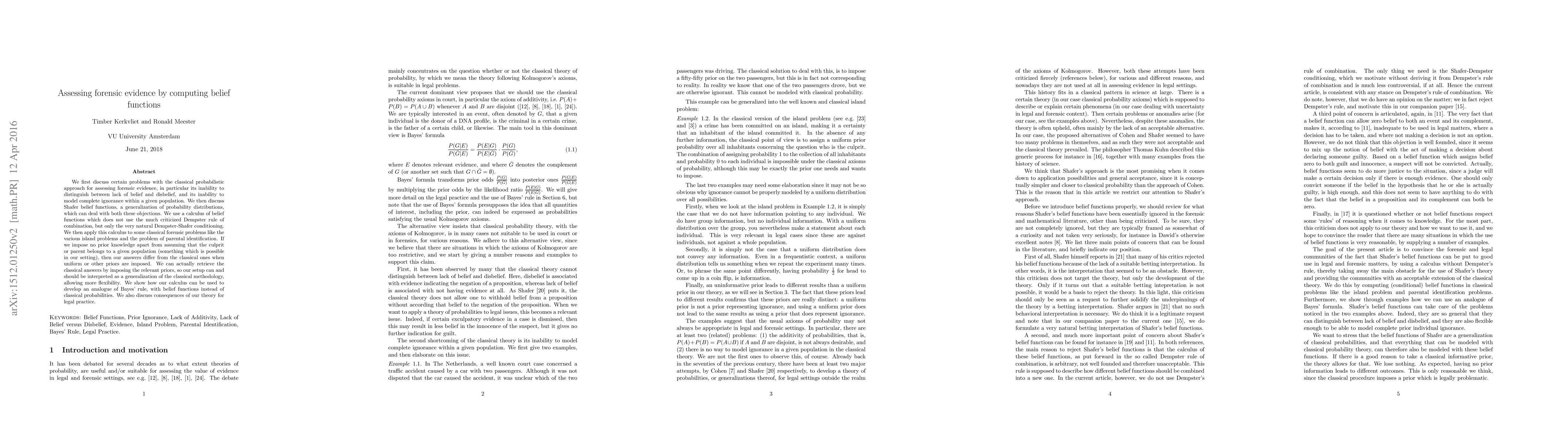 This paper critiques the classical probabilistic approach for assessing forensic evidence, highlighting its inability to differentiate between lack of belief and disbelief, and its failure to model complete ignorance. It proposes Shafer belief functions as a more flexible alternative, using a calculus that avoids the Dempster rule, and demonstrates its application to forensic problems, showing it can generalize classical methods while offering greater flexibility.