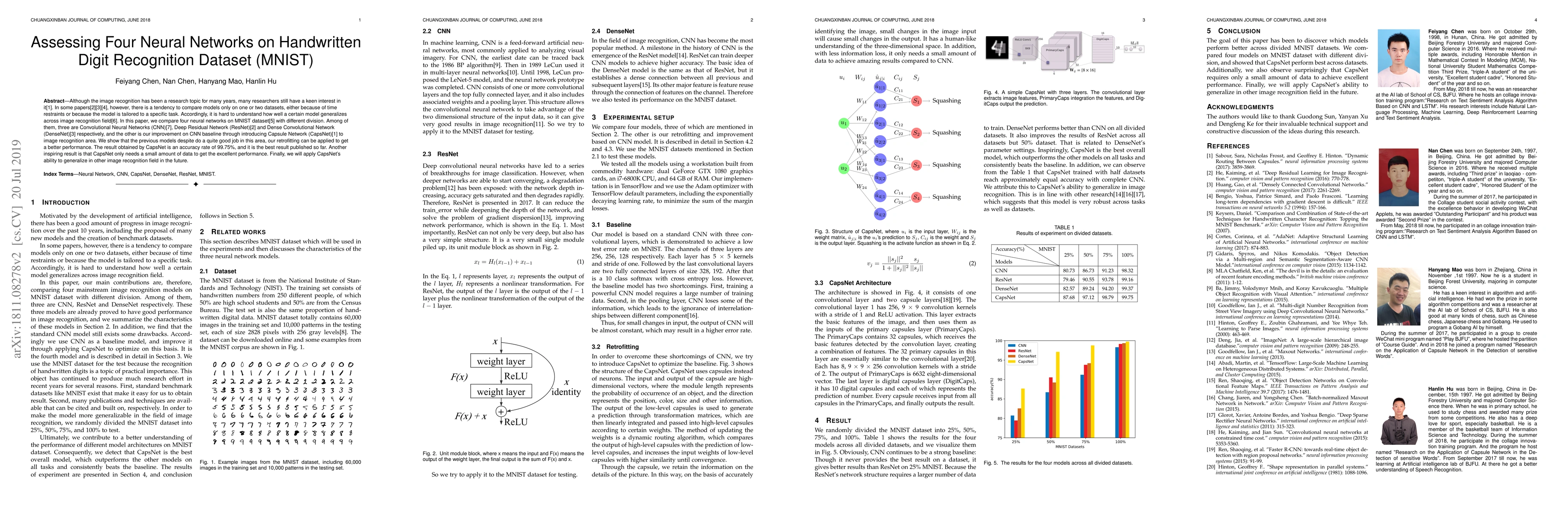 This paper compares four neural networks, including three Convolutional Neural Networks (CNN), Deep Residual Network (ResNet), and Dense Convolutional Network (DenseNet), and an improved CapsNet on the MNIST dataset. The CapsNet model, which integrates a Capsule Network, achieves the highest accuracy rate of 99.75% and demonstrates strong generalization with minimal data.