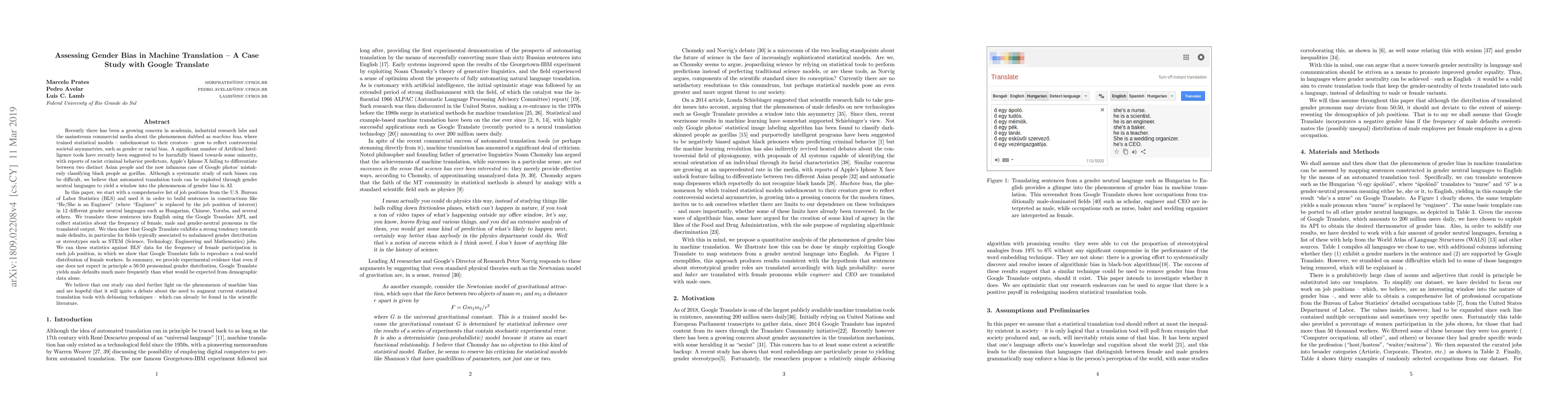This paper investigates gender bias in Google Translate by translating gender-neutral sentences from various languages into English, finding that GT defaults to male pronouns, especially in male-dominated fields like STEM, despite real-world gender distributions. The study calls for integrating debiasing techniques into translation tools.