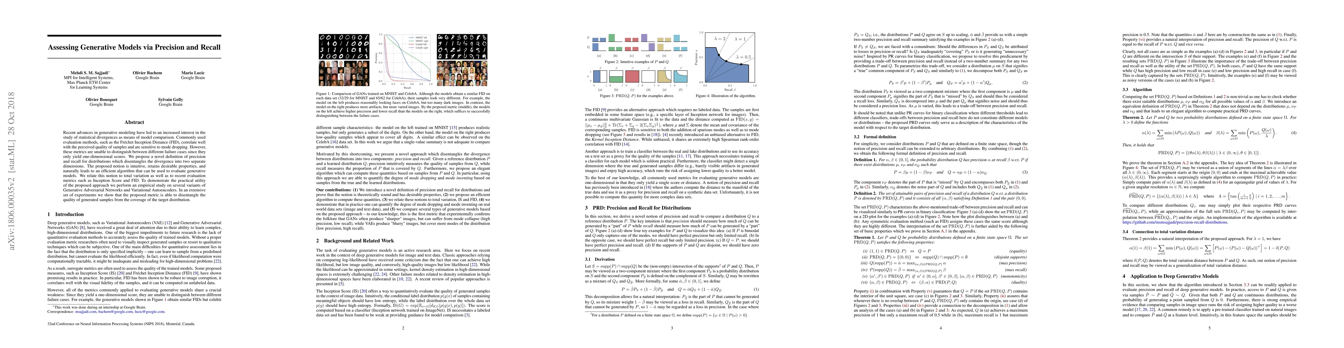 Recent advances in generative modeling have led to an increased interest in the study of statistical divergences as means of model comparison. Commonly used evaluation methods, such as the Frechet Inception Distance (FID), correlate well with the perceived quality of samples and are sensitive to mode dropping. However, these metrics are unable to distinguish between different failure cases since they only yield one-dimensional scores. We propose a novel definition of precision and recall for distributions which disentangles the divergence into two separate dimensions. The proposed notion is intuitive, retains desirable properties, and naturally leads to an efficient algorithm that can be used to evaluate generative models. We relate this notion to total variation as well as to recent evaluation metrics such as Inception Score and FID. To demonstrate the practical utility of the proposed approach we perform an empirical study on several variants of Generative Adversarial Networks and Variational Autoencoders. In an extensive set of experiments we show that the proposed metric is able to disentangle the quality of generated samples from the coverage of the target distribution.