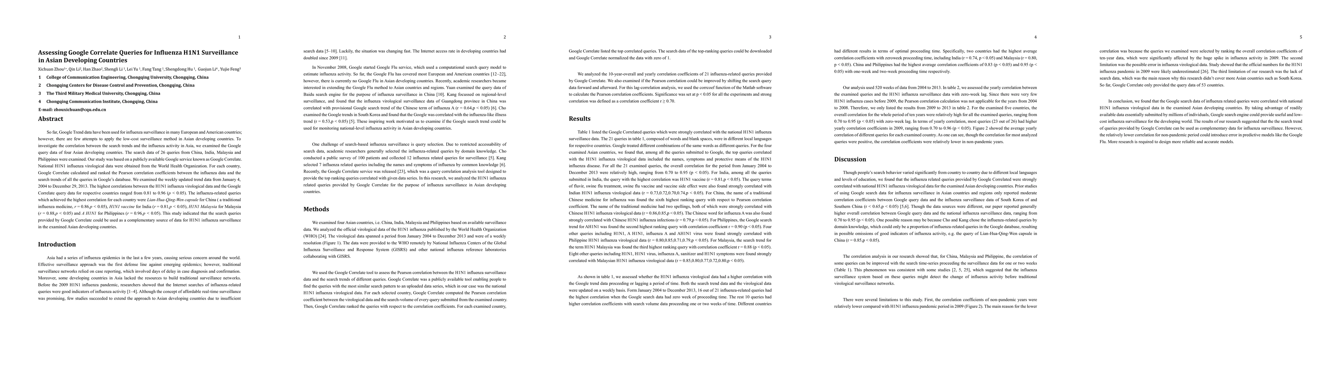 Summary: This study evaluates the utility of Google Correlate queries for influenza H1N1 surveillance in four Asian developing countries, comparing search trends against actual influenza activity to assess the method's effectiveness in regions where it has not been widely applied.