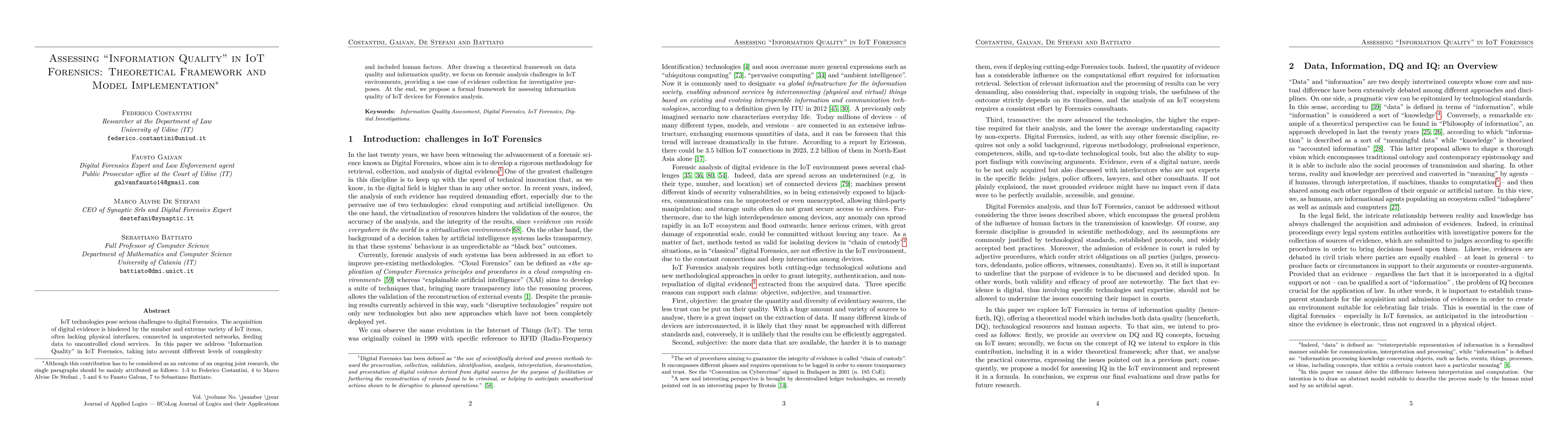 This paper develops a theoretical framework and model for assessing information quality in IoT forensics, addressing the challenges of acquiring digital evidence from numerous diverse IoT devices connected in unprotected networks. It proposes a formal framework to evaluate the quality of information from IoT devices for forensic analysis.