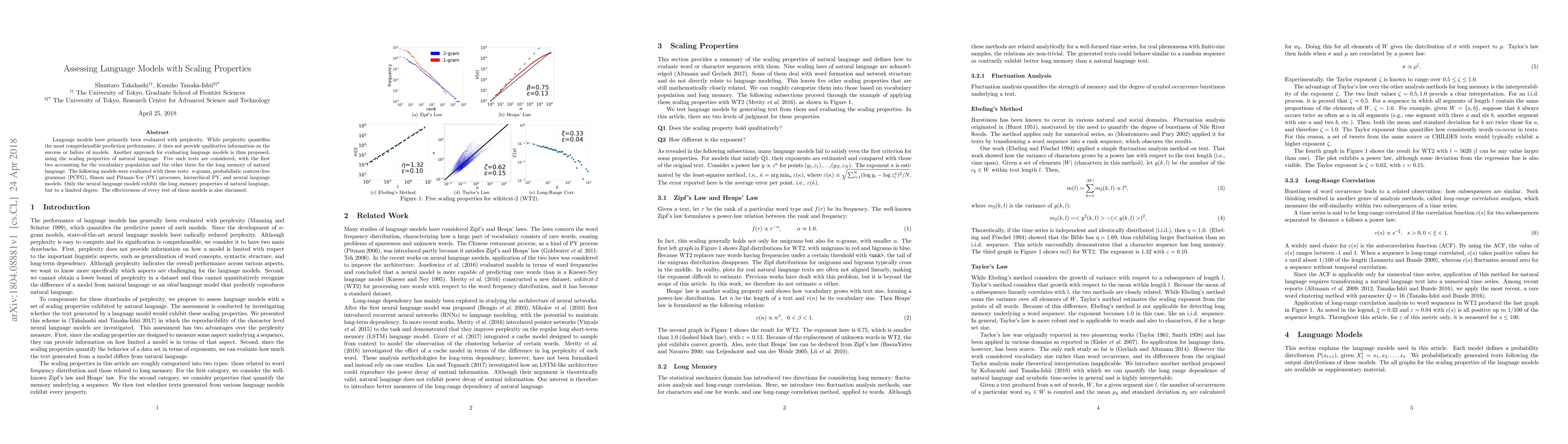 This paper proposes new tests based on scaling properties of natural language to evaluate language models beyond perplexity, assessing n-grams, PCFG, Simon and Pitman-Yor processes, hierarchical PY, and neural models. Neural language models show some long memory characteristics but to a limited extent.