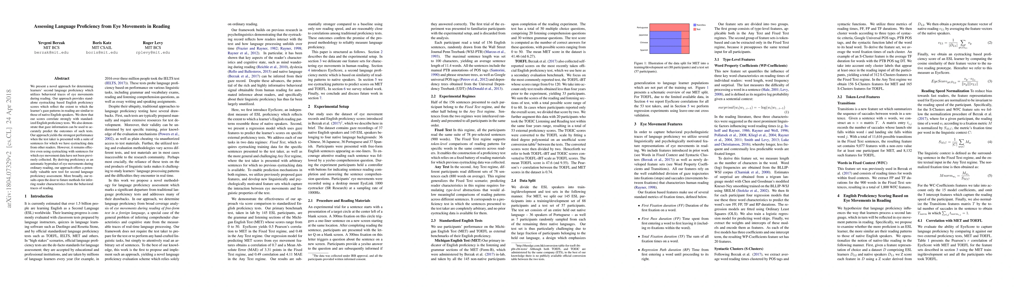 This paper introduces a method for assessing second language proficiency using eye movement data during reading, showing strong correlation with standardized tests. The approach effectively predicts test outcomes and offers a new tool for automatic proficiency evaluation based on reading behavior.