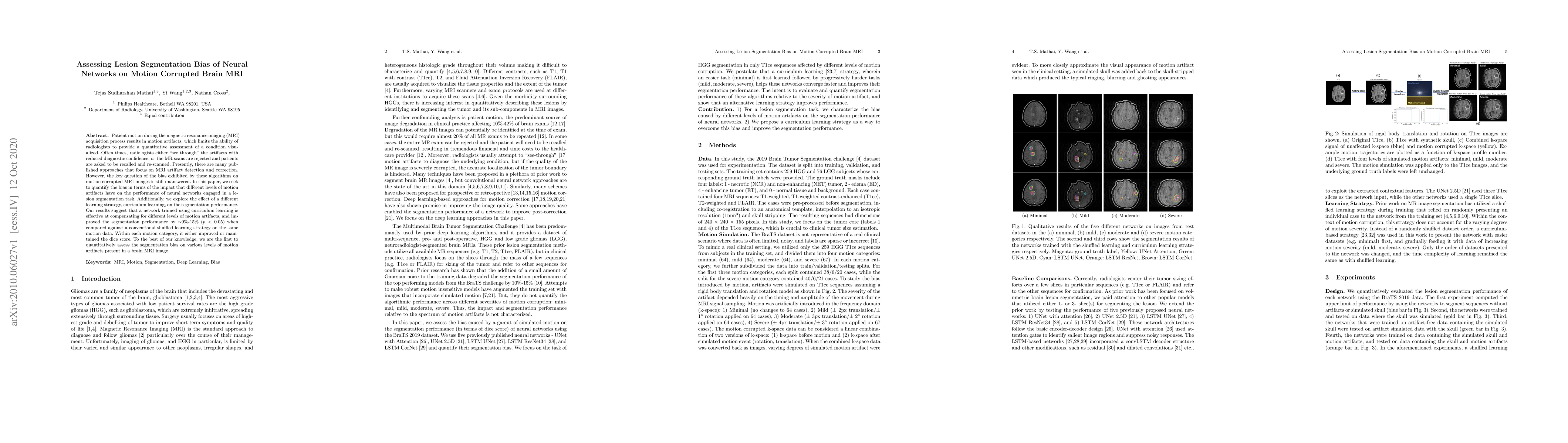 A study found that neural networks can exhibit bias when segmenting lesions on MRI images corrupted by motion artifacts, but using curriculum learning improves segmentation performance by 9-15%.